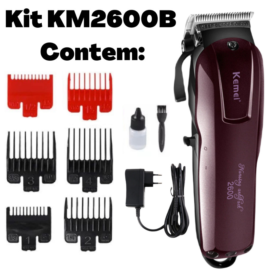 APROVEITE NOSSAS MEGA PROMOÇÃO ! Kit incrível exclusivo de maquinas Kemei KM-2600 + KM-032 + Kit 3 tesouras profissionais para Barbearia. Itens Inclusos: Kit 3 tesouras profissionais Kit composto por: 1 Tesoura Fio Navalha 6.0 polegadas 1 Tesoura Fio Laser 6.0 Polegadas 1 Tesoura Desfiadeira 6.0 polegadas 1 Navalhete 1 Estojo de couro sintético. Máquina de Cortar Cabelo Kemei KM-2600 - Óleo Lubrificante - 4 Pentes de altura - 2 Pentes desfarce - 1 Carregador - 1 Manual - 1 Capa Protetora para Lâmina Máquina Kemei KM-032 - 1 Cabo USB - 3 Pentes de altura - 1 Óleo Lubrificante - 1 Escova para Limpeza Especificações: -Máquina de Cortar Cabelo Kemei KM-2600 Modelo: KM-2600 Voltagem: 100v - 240v (Bivolt) Frequência: 50/60 hz Potência: 9 W Tempo de carregamento: 1 hora Usando o tempo: 120 minutos Modo de limpeza: Limpe com escova de limpeza Tamanho: 19 cm Comprimento 4.5 cm Largura Peso: 490g Lâmina de aço de carbono e motor super potente, pode cortar qualquer tipo de cabelo rapidamente e com precisão, sem o cabelo ficar preso e a tecnologia de segurança permite não ferir a sua pele. Uma lâmina conveniente, e alavanca para ajustar o comprimento da lâmina, proporcionando um desempenho mais suave e mais preciso em seu cabelo. Com um laço pendurado no rabo da máquina de cortar, fica fácil de pendurar e armazenar após o uso. Cabo e sem fio de dupla utilização. Não tem mais que se preocupar com a tensão de onde for usar a máquina pois o produto é Bivolt. Após 1 hora carga completa, ele pode ser usado continuamente por 120 minutos. Máquina Kemei KM-9163 Modelo: KM-9163 Acompanha 3 pentes guia tamanhos 1mm/2mm/3mm Para você já receber e começar a praticar seus cortes ! Totalmente recarregável em uma entrada USB, acompanha o cabo USB - 2 a 5 horas de carga lhe dá de 1 a 2 horas de uso. Potência: 3-5W Voltagem Bivolt: 110/ 220