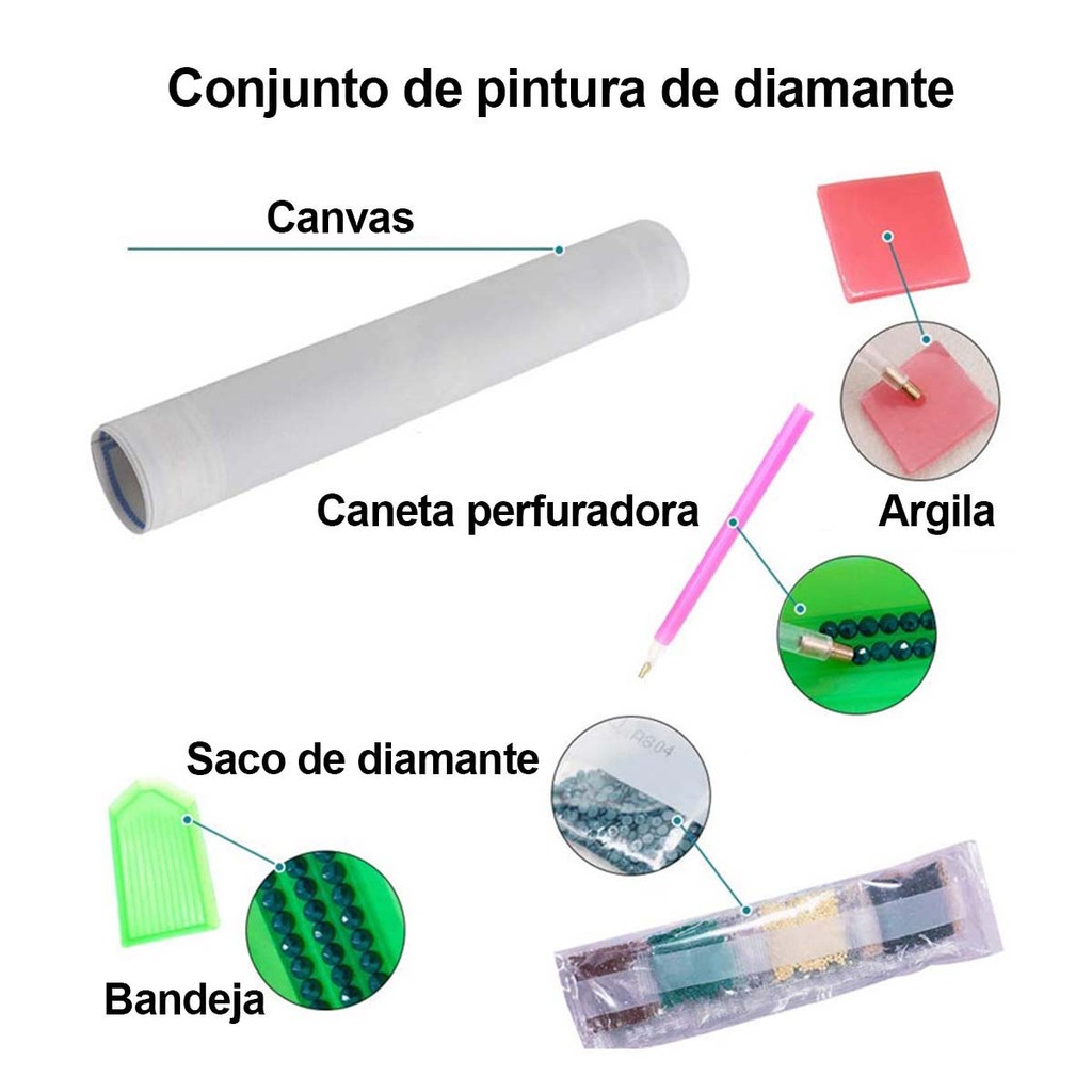 Lista de produtos: 1x caneta de diamante 1 tela 1 argila (2*4cm) 1 bandeja de diamante Diamantes redondos suficientes (oferece 20% de pontos de diamante adicionais) ESPECIFICAÇÕES: Material: Diamante+ Lona Tamanho: 12 x 16 Inch (30x40 cm) Adicione alegria à vida: As artes com diamantes de gemas DIY podem melhorar a habilidade prática, reduzir o estresse e aliviar as emoções, ter uma sensação de realização, aumentar a autoconfiança e cultivar a paciência, o que é adequado para adultos e idosos. INSTRUÇÕES PARA KITS DE PINTURA DE DIAMANTES 5D PARA ADULTOS: 1. Abra os kits de pintura de diamantes verifique as ferramentas de pintura de diamantes. 2. Leia o número na tela e encontre o mesmo número em sua bolsa de diamantes. 3. Coloque um pouco de cola na parte superior de sua caneta. 4. Coloque os diamantes de que você precisa na bandeja de diamantes. Pegue os pontos de diamante correspondentes na bandeja de diamantes com a ajuda da caneta. 5. Cole o diamante na tela. 6. O restante dos diamantes pode ser colocado dentro do saco plástico. 7. Quando terminar a pintura artística de diamantes, não se esqueça de pressionar a obra de arte, o que pode tornar a pintura mais fixa. DICAS: 1. Não dobre a tela quando estiver pintando com o kit de pintura com diamantes, para que sua obra de arte fique mais bonita quando estiver pronta. 2. Há um filme plástico na tela que deve proteger a aderência da tela. Portanto, não remova todo o filme plástico de uma só vez. 3. A moldura de pintura não está incluída nesse quadro.