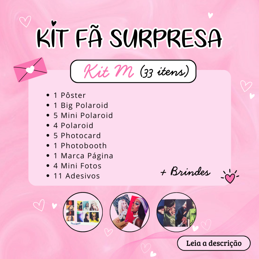 ✨ KITS SURPRESA ✨ Fizemos algumas atualizações em nossa loja e selecionamos os melhores itens para vocês. ♥ - Nossos itens são impressos em papel fotográfico 230g com ótima resolução e qualidade premium. - Os ID Cards são plastificados para garantir durabilidade e resistência (caso tenha no kit). - Nossos itens são à prova d'água. - Nossos pedidos não são enviados em caixas. - Os itens plastificados (na opção selecionada) são: os photocards, e o marca página. Antes da atualização nós trabalhavamos da seguinte forma: Kit 1 (14 itens) e Kit 2 (19 itens), adicionamos mais itens nos kits para o seu melhor aproveitamento. 🩷 Conteúdo: 🎀 Kit P (20 Itens): - 6 Photocards, 2 Polaroids, 6 Mini Polaroids, 6 Adesivos. 🎀 Kit M (33 Itens): - 1 Mini Poster (Apx. 10x15 cm), 1 Big Polaroid, 5 Mini Polaroids, 4 Polaroids, 5 Photocards, 1 Photobooth, 1 Marca Página, 4 Mini Fotos, 11 Adesivos. 🎀 Kit G (50 Itens): - 2 Mini Poster (Apx. 10x15 cm), 2 Big Polaroid, 1 Photobooth, 1 Marca Página, 5 Polaroids, 5 Mini Polaroids, 10 Mini Fotos, 6 Photocards, 1 ID Card Plastificado, 16 Adesivos, 1 Chaveiro com 4 fotos. Temos a opção de PHOTOCARDS comuns ou plastificados (apenas os photocards são plastificados no KIT!!!!), basta selecionar no momento da compra. Lembrando que nossos photocards são todos feitos a mão, sendo assim não são tão firmes iguais aos originais. Nossos kits são fan made e tentamos fazer com o máximo de carinho possível, de fã para fã. 🩷 ⚠️ Caso seja um presente e queira adicionar um bilhete ao pedido, é só nos notificar. Qualquer dúvida é só nos chamar no chat que te ajudamos ♥ Siga-nos para mais novidades e ofertas exclusivas! ✨