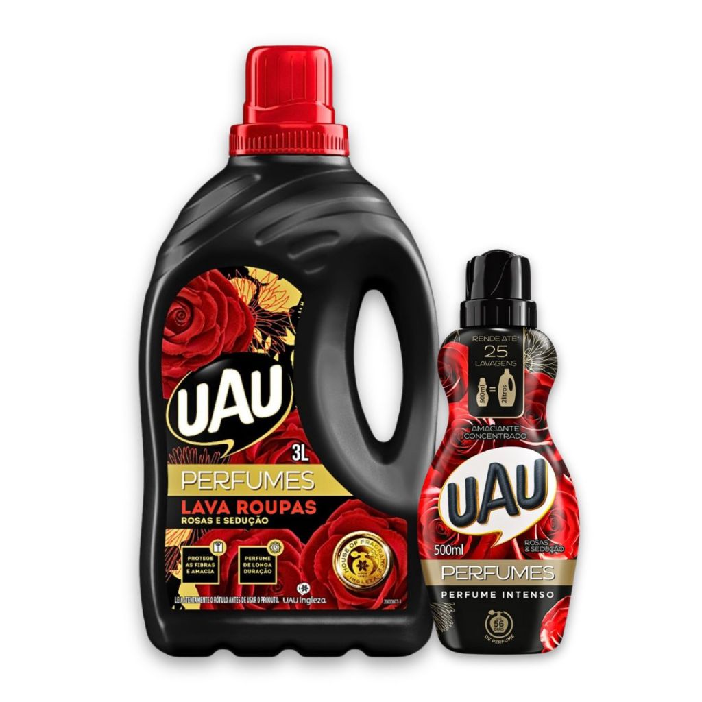 Kit UAU com lava-roupas líquido e amaciante concentrado, desenvolvido para limpeza eficiente, cuidado com os tecidos, maciez e perfume duradouro. Cada variação corresponde a 1 kit, com composição definida abaixo. VARIAÇÕES DO ANÚNCIO Kit 1 – Rosas e Sedução Conteúdo do kit: • 1 Lava-Roupas Líquido UAU Rosas e Sedução 3L • 1 Amaciante Concentrado Uau Rosas E Sedução 500ml Kit 2 – Chá Branco Conteúdo do kit: • 1 Lava-Roupas Líquido UAU Chá Branco 2,7L • 1 Amaciante Concentrado UAU Chá Branco 450ml Kit 3 – Active com Carinho e Conforto Conteúdo do kit: • 1 Lava-Roupas Líquido Active UAU 3L • 1 Amaciante Concentrado UAU Carinho e Conforto 500ml