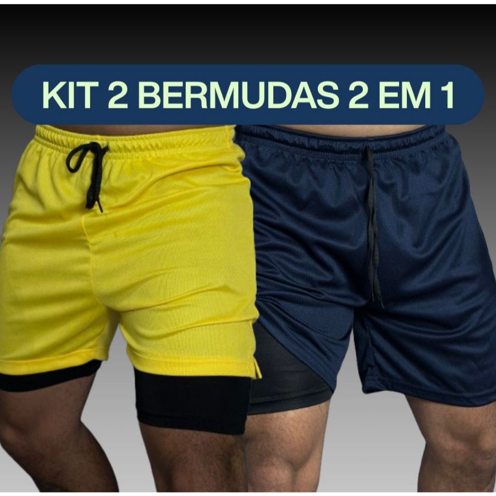 Kits Shorts 2 em 1 Dry Fit Esportivo Academia Bolso Interno Versátil Corrida Treino Com Elastano