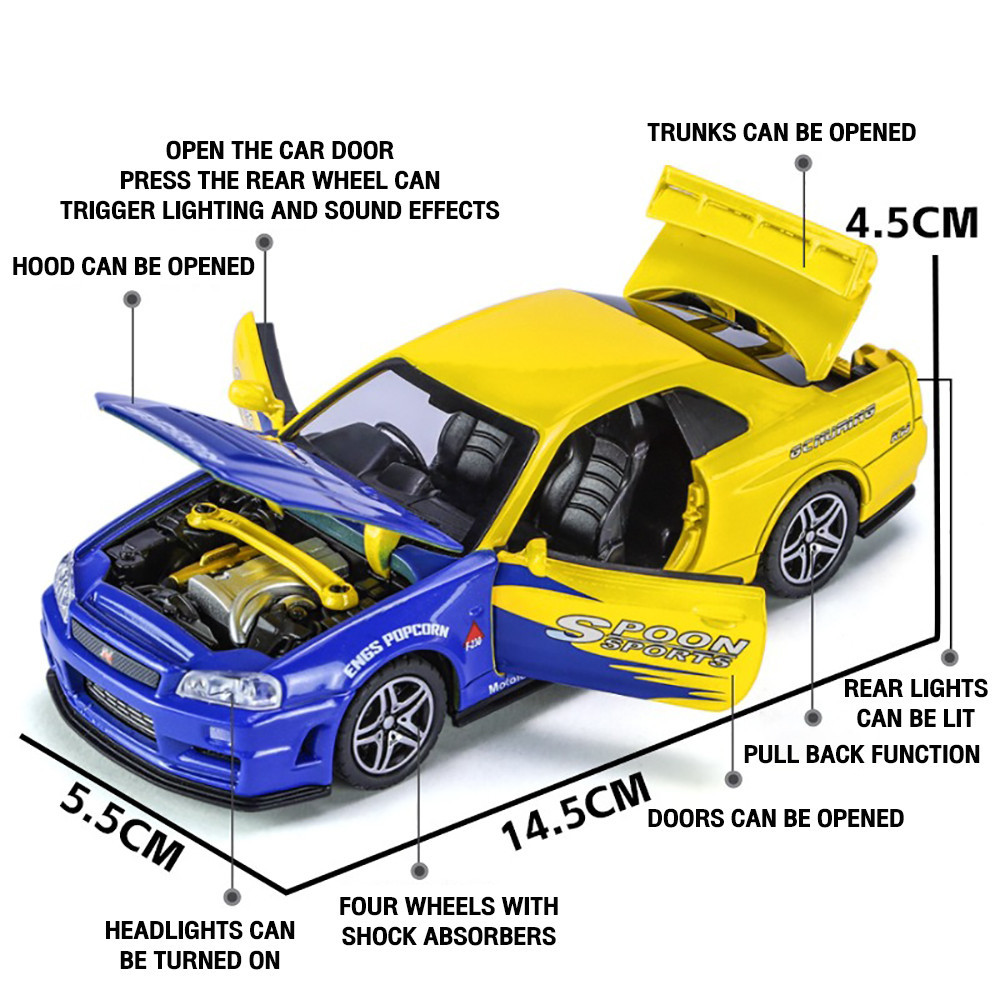 KLT 1 : 32 Nissan GTR R34 Metal Alloy Toys Car Modelo Veículo Diecast Para Meninos Simulação De Som Efeito Luz Hobbies Coleção De