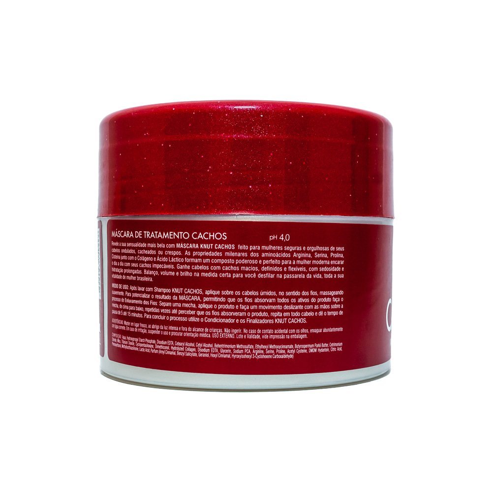 A Máscara Knut Cachos, foi desenvolvida para cabelos ondulados e cacheados naturais ou com química, com a mais alta tecnologia cosmética. Contém colágeno pró V, uma proteína essencial para manter os cachos controlados, reduzindo o frizz e o volume, e aminoácidos de arginina deixando os cabelos cacheados ainda mais hidratados, macios, maleáveis e com um balanço incrível.