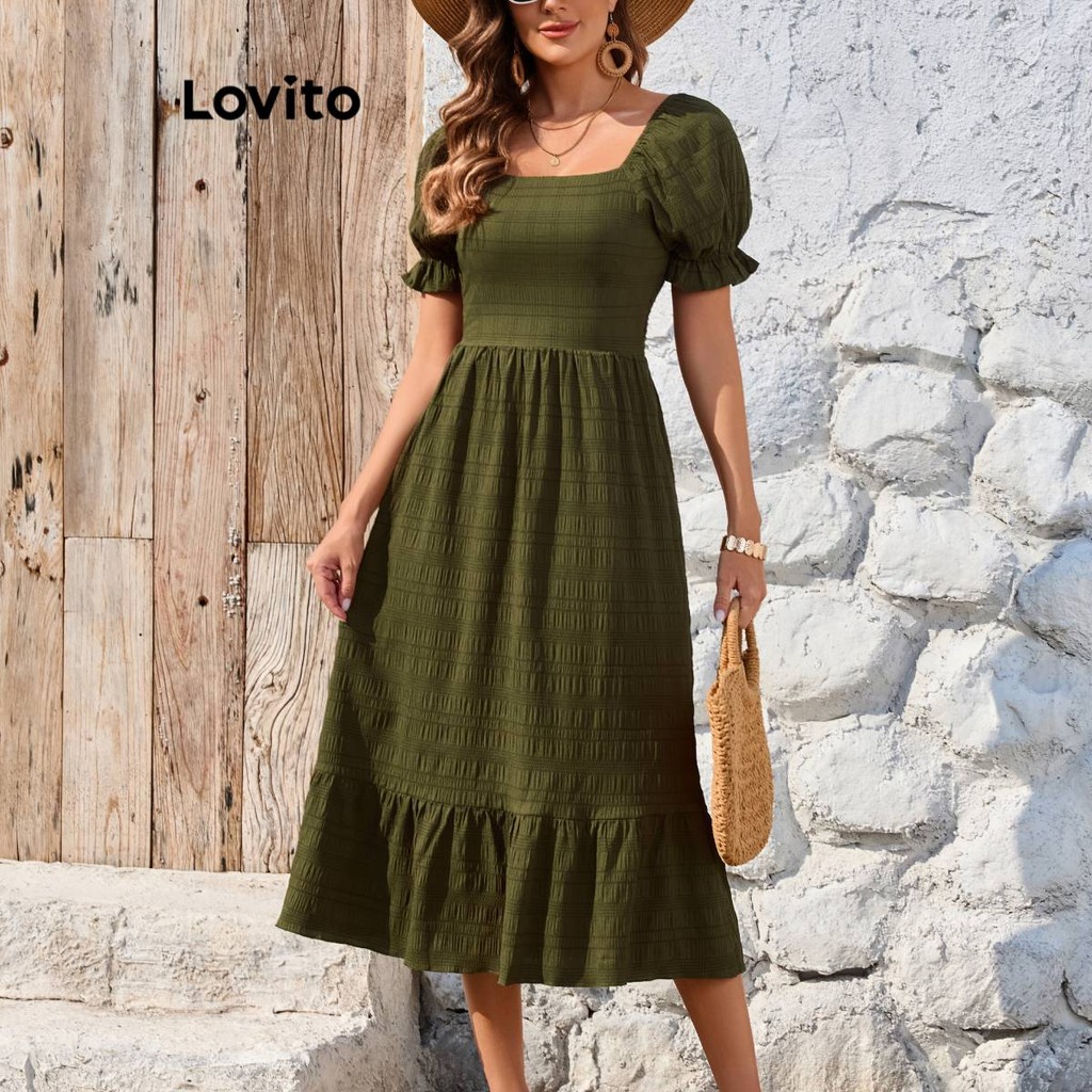 (KOL‘s pick) Lovito Vestido Boho liso com bainha em camadas e mangas bufantes para mulheres LBL19072