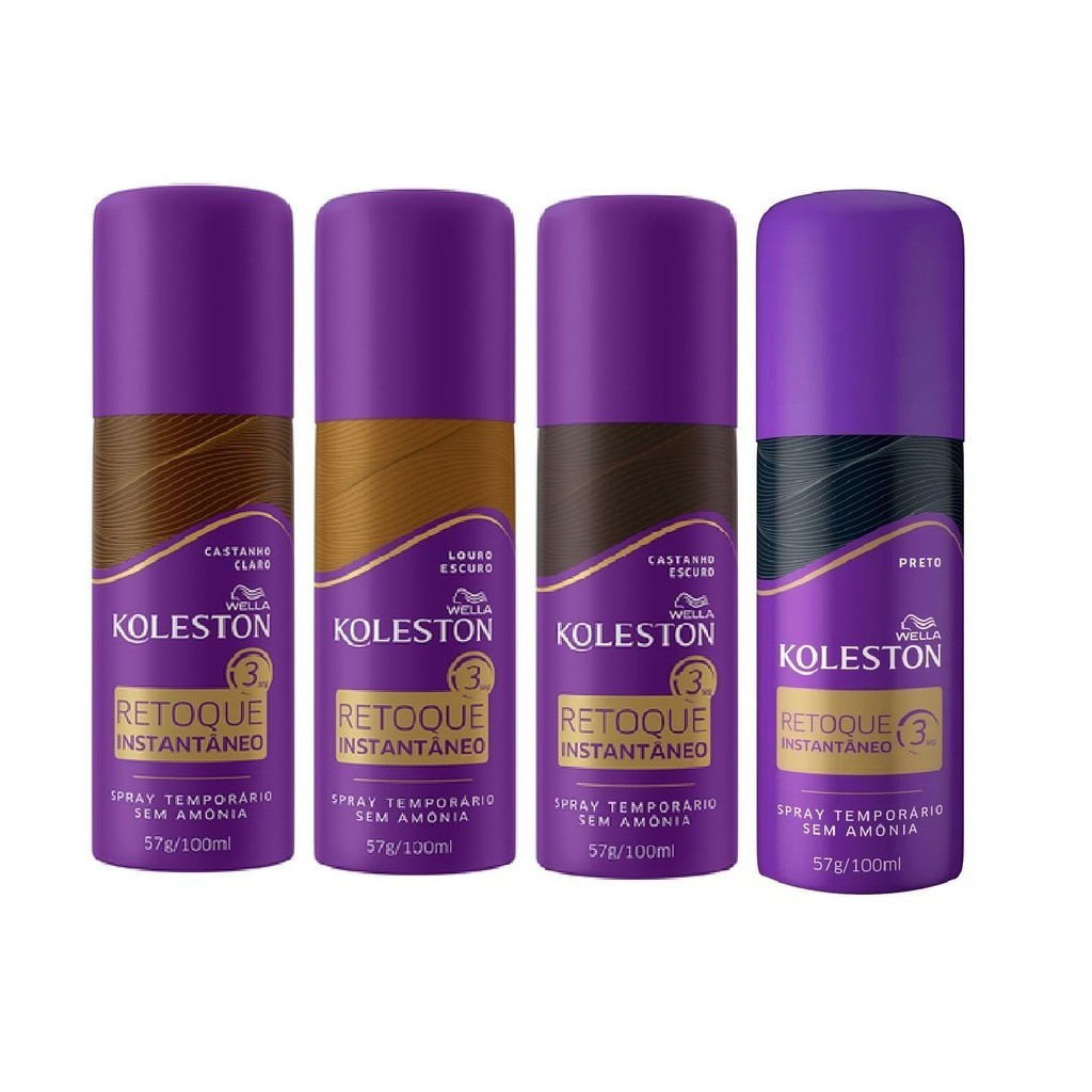 ***Produto com mudança de embalagem ***Cores:-Preto-Castanho Claro-Castanho Escuro (Castanho médio a castanho escuro)-Louro Escuro (Louro médio a Louro escuro)Koleston Spray Retoque Instantâneo de Wella é seu segredo para raízes perfeitas em apenas 3 segundos, a qualquer momento, em qualquer lugar. Ele é resistente à água e à umidade, para que você possa passar seu dia sem se preocupar com retoques. Nossa fórmula é livre de amônia e de peróxido e é dermatologicamente testada, suave com seu cabelo e couro cabeludo. O Spray é uma maquiagem, então sai com shampoo. Cabe na bolsa.Modo de uso:-Agite a lata-Aplique a 15cm de distancia da raiz para cobrir os fios brancos de forma uniforme em 3 segundos