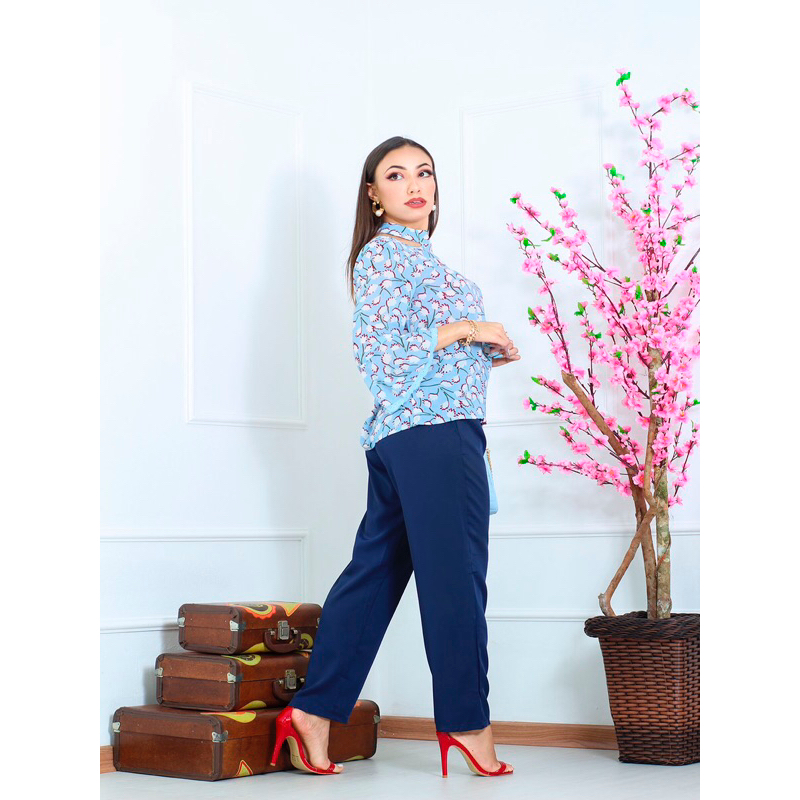 Blusa feminina estampa delicada modelo manga 3/4 manga flare com detalhe de ombro aberto com detalhe de botão atras largura P 48 M 50 G 52 Comprimento P 60 M 60 G 60