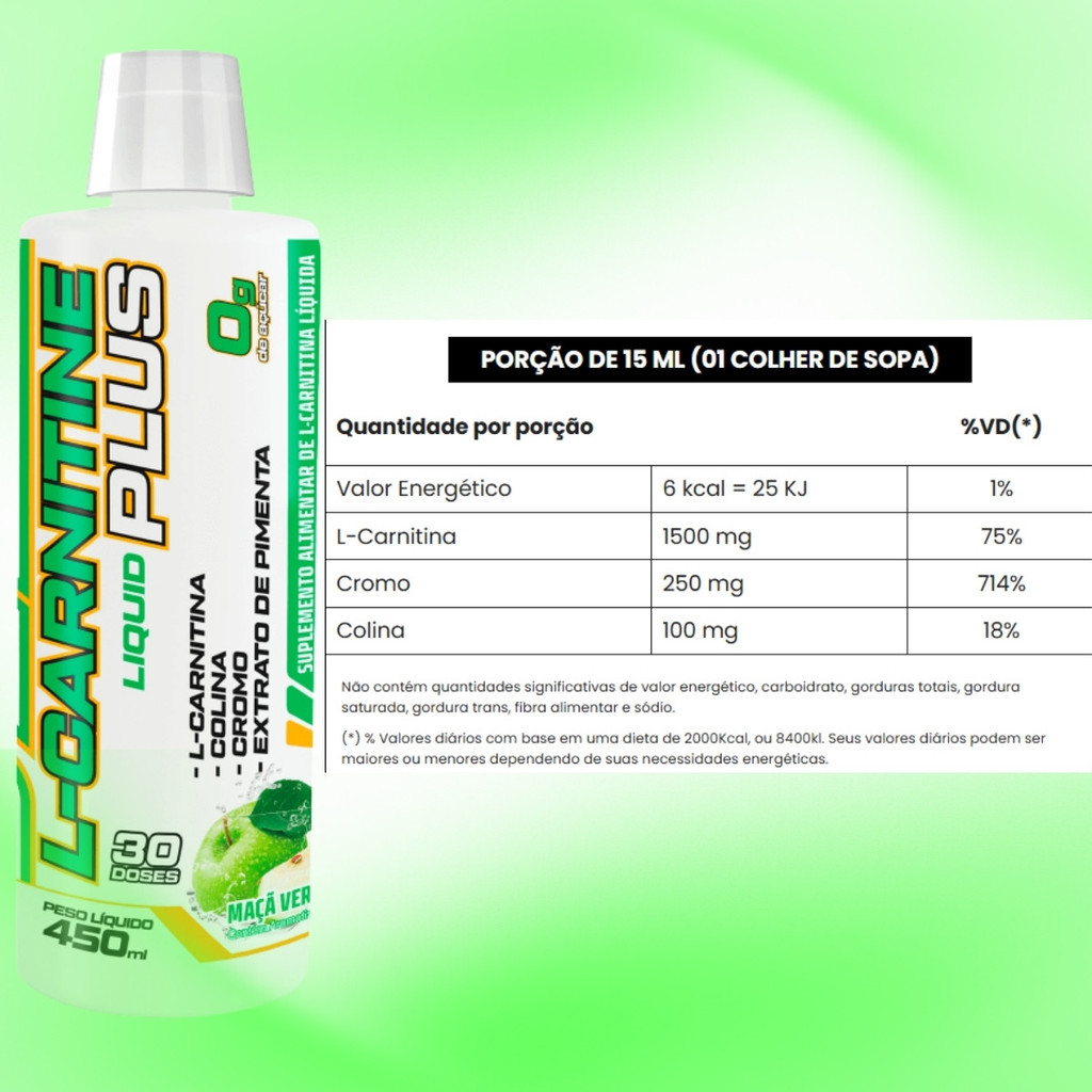 L-Carnitina Plus Líquida – 450ml Descrição: Suplemento alimentar de L-Carnitina em formato líquido, com colina e cromo, ideal para complementar a dieta de adultos. Produto saboroso, fácil de consumir e sem glúten. Informação Nutricional – Porção de 15 ml (1 colher de sopa) - Valor Energético: 6 kcal = 25 kJ (1% VD) - L-Carnitina: 1500 mg (75% VD) - Cromo: 250 mcg (714% VD) - Colina: 100 mg (18% VD) - Não contém quantidades significativas de carboidratos, proteínas, gorduras totais, saturadas, trans, fibras e sódio. - (*) % Valores Diários com base em uma dieta de 2000 kcal ou 8400 kJ. Ingredientes: - Água purificada, L-Carnitina, bitartarato de colina, extrato de pimenta caiena, ácido cítrico, cromo, aroma idêntico ao natural de frutas vermelhas e edulcorante sucralose. Conservantes: Sorbato de potássio e Benzoato de sódio. Modo de uso: - Consumir 1 colher de sopa (15 ml) ao dia, preferencialmente antes da atividade física ou conforme orientação profissional. Advertências: - Este produto não é um medicamento. - Não exceder a recomendação diária de consumo indicada na embalagem. - Conservar ao abrigo da luz e manter fora do alcance de crianças. Informações adicionais: - Não contém glúten.