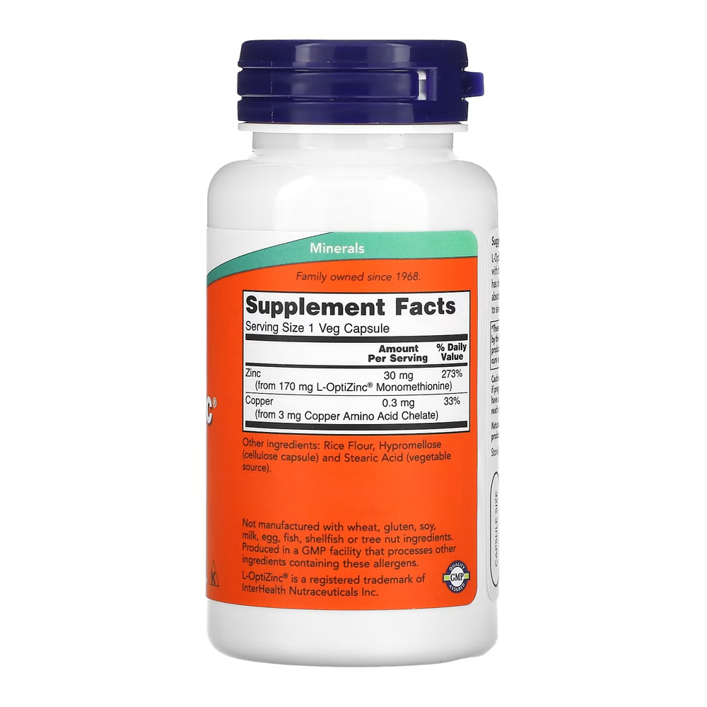L-OptiZinc 30mg Now Foods 100 Veg Cápsulas Porta Cápsulas