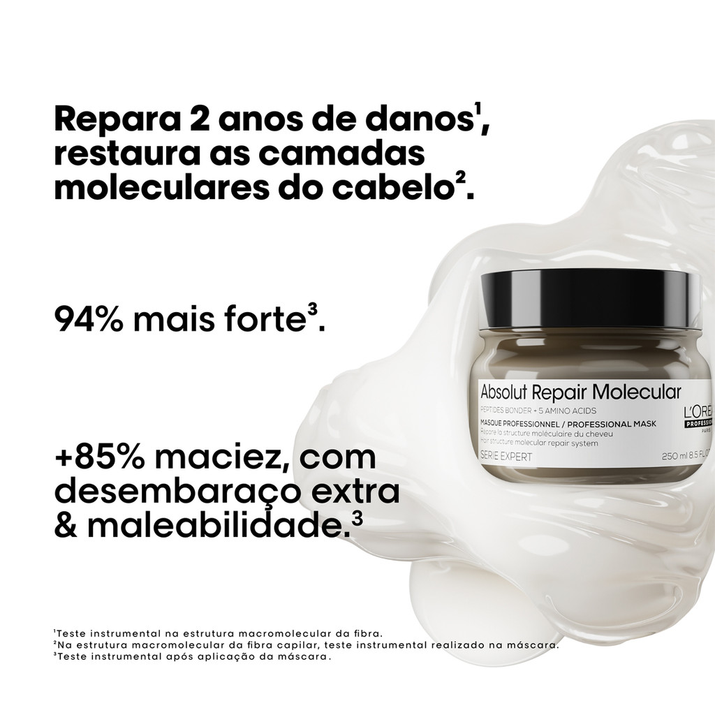 L'Oréal Professionnel Absolut Repair Molecular - Máscara Capilar 250g Para cabelos danificados, repara e reconstrói profundamente a estrutura molecular do cabelo. Com fórmula exclusiva que repara 2 anos de danos a partir da primeira aplicação, tecnologia que decompõe os peptídeos, possibilitando que penetrem na fibra capilar e reconstruam a estrutura molecular do cabelo. Confere fios mais fortes, com elasticidade, movimento e maciez. Conselho de Aplicação Aplique a máscara sobre o cabelo limpo e úmido. Distribua uniformemente pelo comprimento e pontas dos fios. Desembarace com os dedos, torça o cabelo e deixe agir por 1 a 2 minutos. Enxágue bem. Para cabelos grossos use em cada lavagem, para os demais tipos de cabelo, uma vez por semana.