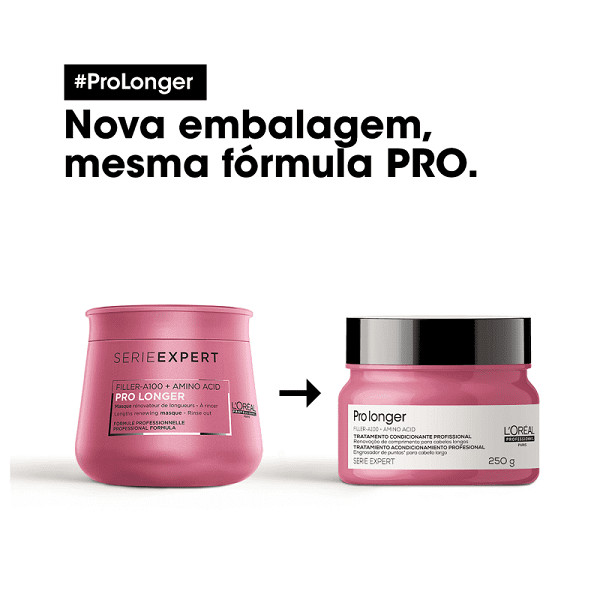 Máscara de tratamento para cabelos longos com pontas afinadas ou danificadas. L'Oréal Professionnel Serie Expert Pro Longer hidrata e devolve densidade aos fios. Com ação renovadora, a Máscara L'Oréal Professionnel Serie Expert Pro Longer confere uma redução de até 66% das pontas duplas, graças a sua fórmula que contém ativos poderosos e inovadores. O resultado que a máscara L'Oréal Pro Longer entrega é um cabelo longo mais forte, denso, com brilho e preenchimento de pontas danificadas e afinadas. Conselho de Aplicação Aplique sua L'Oréal Pro Longer, concentrando a máscara no cabelo lavado e úmido, após utilização do shampoo. Deixar agir por 3 a 5 minutos. Enxágue bem. Dica de tratamento: o Condicionador L'Oréal Professionnel Serie Expert Pro Longer pode ser usado após a máscara de tratamento para selar as cutículas do cabelo.