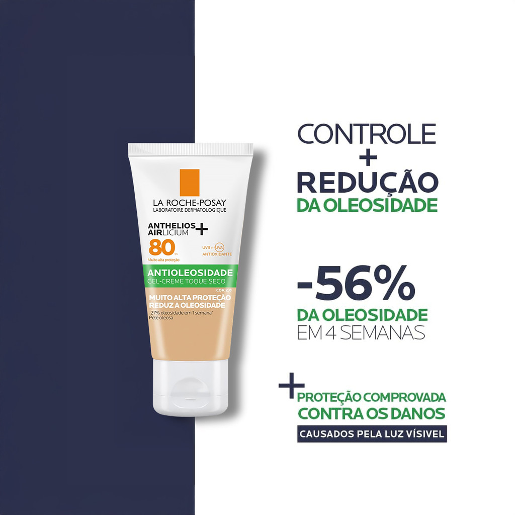 La Roche-Posay Anthelios Airlicium FPS80 Cor 2.0 - Protetor Solar com Cor 40g Protetor solar facial com cor, ideal para peles oleosas. Com FPS80, sua fórmula oferece proteção e tratamento que reduz a oleosidade em 27% em apenas uma semana e 56% em um mês. Possui textura fluída, ultra leve e de rápida absorção, sem pesar, escorrer ou craquelar. Traz uma sensação de pele limpa e fresca por até 12 horas, com alta proteção solar e contra pigmentação causada pela luz visível. Indispensável para sua rotina diária. Conselho de Aplicação Aplique abundantemente sobre a pele 30 minutos antes da exposição ao sol. Se a quantidade aplicada não for adequada, o nível de proteção será significativamente reduzido. É necessária a reaplicação do produto para manter a sua efetividade.