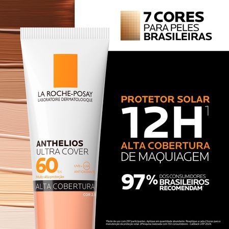 O PROTETOR SOLAR FACIAL ANTHELIOS ULTRA COVER FPS60 é o 1º protetor solar com performance de maquiagem que oferece muito alta proteção e 12h de cobertura de base em uma única camada. Sua fórmula desenvolvida no Brasil conta com uma tecnologia revolucionária de pigmentos que mimetizam o reflexo de luz natural da pele, promovendo alta cobertura, com uma textura leve que não craquela e um acabamento de pele natural. Além disso, a tecnologia inovadora por trás dos pigmentos faz com que a cobertura tenha maior durabilidade e um sensorial super agradável. COMO USAR: Aplique abundantemente sobre a pele 30 minutos antes da exposição ao sol. Se a quantidade aplicada não for adequada, o nível de proteção será significativamente reduzido. É necessária a reaplicação do produto para manter a sua efetividade. Reaplicar sempre, após sudorese intensa, nadar ou banhar-se, secar-se com toalha e durante a exposição ao sol. Produto de uso adulto. Evite exposição prolongada das crianças ao sol. Este produto ajuda a prevenir as queimaduras solares. Este produto não oferece nenhuma proteção contra insolação. O abuso do sol é perigoso.