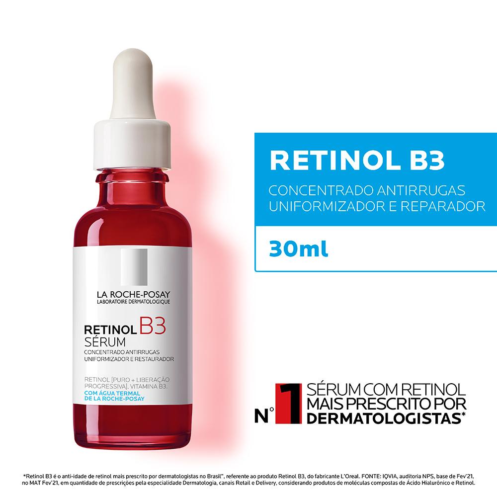La Roche-Posay Retinol B3 é um sérum facial concentrado com alta eficácia antirrugas e máxima tolerância mesmo nas peles mais sensíveis. Ele possui uma textura sérum não oleosa de rápida absorção e possui em sua fórmula uma combinação de complexo retinol + ácido hialurônico + vitamina B3 + água termal de La Roche-Posay. * RESULTADO: Antirruga * SUGESTÕES DE USO: 1. A aplicação deve ser feita à noite, usando de 2 a 3 gotas no rosto e pescoço. 2. É recomendável utilizar o produto em associação com um filtro solar de proteção diária (FPS acima de 15). * ITENS INCLUSOS: 1 La Roche-Posay Retinol B3 Sérum Facial Antirrugas 30ml