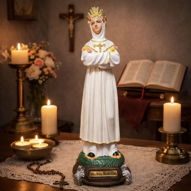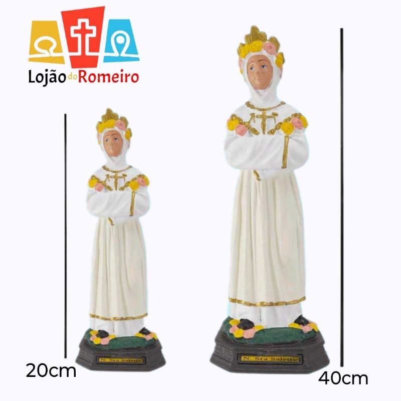 imagem da Nossa Senhora de Lá Salette Material : borracha Peso aproximado 600g Tamanho: 20cm ou 40cm e 30cm Posição : em pé ou sentada Produto ecologicamente correto Pode lavar Ideal pra quem tem crianças e bichinhos de estimaçao em casa! Imagem da Nossa Senhora Lá Sallete produzida em borracha PVC de alta qualidade, com aproximadamente 40 cm, 30cm e 20cm de altura e peso em torno de 500 g. Trata-se de um produto ecologicamente correto, resistente e durável, podendo ser exposto ao sol e à água sem comprometer sua aparência. Cada peça é cuidadosamente pintada à mão por artistas da região, garantindo um acabamento único e cheio de detalhes. Ideal para ambientes com crianças e animais de estimação, pois une beleza, segurança e praticidade no dia a dia.