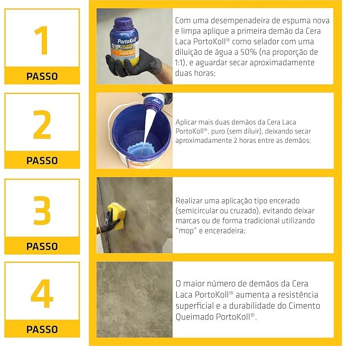 Descrição Cera Laca Para Cimento Queimado 500ML - A Cera Laca para Cimento Queimado 500ml da PortoKoll é um produto de alta performance, desenvolvido especificamente para proteger e realçar a beleza de revestimentos em cimento queimado. Sua formulação exclusiva cria uma camada de proteção durável, que confere um acabamento acetinado elegante e valoriza a textura natural do cimento. Características Detalhadas: Proteção Avançada: Forma uma barreira protetora contra manchas, riscos, poeira e outros agentes externos, preservando a integridade e a aparência do cimento queimado. Reduz a absorção de água e outros líquidos, facilitando a limpeza e manutenção do revestimento. Acabamento Estético: Proporciona um brilho suave e uniforme, que realça a beleza do cimento queimado sem alterar sua textura original. O acabamento acetinado confere um toque de sofisticação e elegância ao ambiente. Durabilidade e Resistência: Aumenta a resistência do revestimento ao desgaste, prolongando sua vida útil e reduzindo a necessidade de manutenções frequentes. Resistente a riscos e arranhões, mantendo a aparência impecável do cimento queimado por mais tempo. Facilidade de Aplicação: A formulação líquida e fluida da cera facilita a aplicação com um pano limpo ou aplicador de cera. Secagem rápida, permitindo o uso do ambiente em pouco tempo após a aplicação. Versatilidade de Uso: Adequada para uso em pisos, paredes, bancadas e outras superfícies de cimento queimado, tanto em áreas internas quanto externas. Pode ser aplicada em diferentes tipos de cimento queimado, como os utilizados em ambientes residenciais, comerciais e industriais.