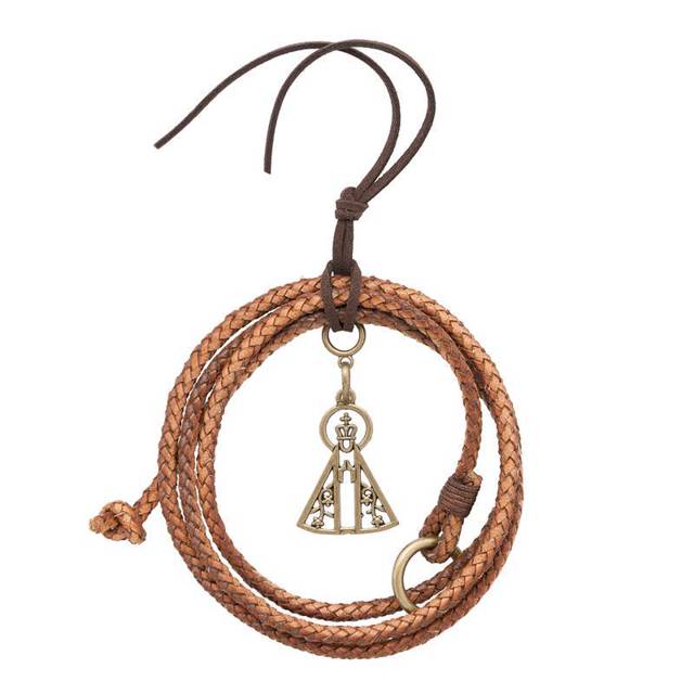 Laço Adorno em Couro Retrovisor Carro com Pingente Nossa Senhora Aparecida Ouro Velho
