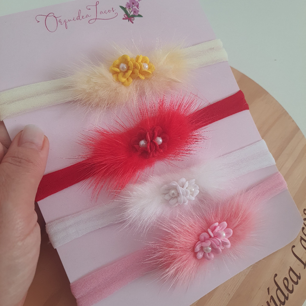 Laços na faixinha slim com pelinho e florzinha no meio. > Temos em 4 cores amarelo, rosa , vermelho e branco. > Modelinho meigo e delicado, que combina com qualquer look, feito com muito amor e carinho para sua princesa. > Nossas faixinhas são tamanho único!! > Serve do nascimento até 2 anos de idade. > Elas são super confortáveis, não apertam, vão esticando confirme desenvolvimento da cabecinha da neném. * Cada laço média 6cm * Feito na faixinha da marca passo fofo. Fico disposição no chat caso necessite de mais alguma informação. Abraço 🎀 Orquídea laços 🎀