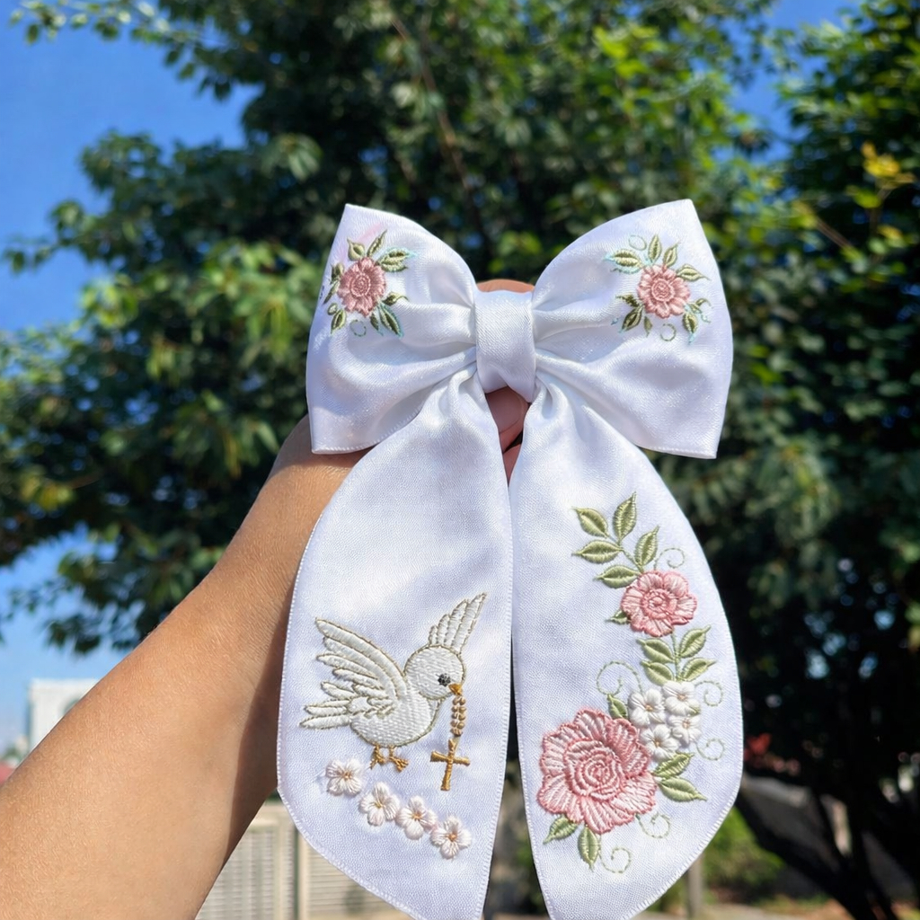 Laço de Batizado Bordado Pomba da Paz e Rosas – Tecido Branco Delicado