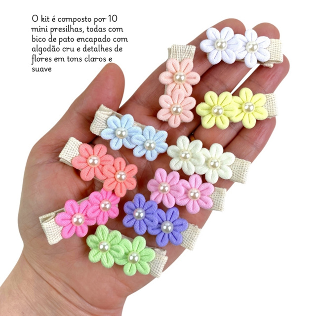 Laço de Cabelo Bebê Rn Florzinha Kit 10 Mini Lacinhos Lacinhos de cabelo infantil, confeccionados em algodão cru com detalhe de florzinhas e pérola, feito à mão com muito amor e carinho, possui bico de pato 3,5 cm forrado e com borrachinha antideslizante. Informações Adicionais Material: Algodão cru Bico de Pato: 3,5 cm Com borracha antideslizante Cores dos lacos do kit: Branco, creme, laranja, amarelo limão, azul, coral, rosa claro, rosa, lilás, verde (1unidade de cada cor) Medida: Aprox. 3,5 cm Feito à mão OBS: O kit de mini presilhas possui florzinhas em tons claros; O brilho da tela pode influenciar na cor do produto; Os lacinhos podem apresentar mínimas diferenças de um para o outro, devido ser um produto feito à mao. Atenção! O laço é um acessório decorativo para bebês e crianças. Evite que a criança leve o laço à boca ou brinque com ele sem supervisão.