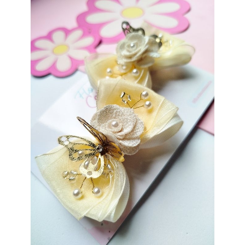 Laço de cabelo infantil Tema Jardim Encantado - Parzinho flores e borboletas com pérolas