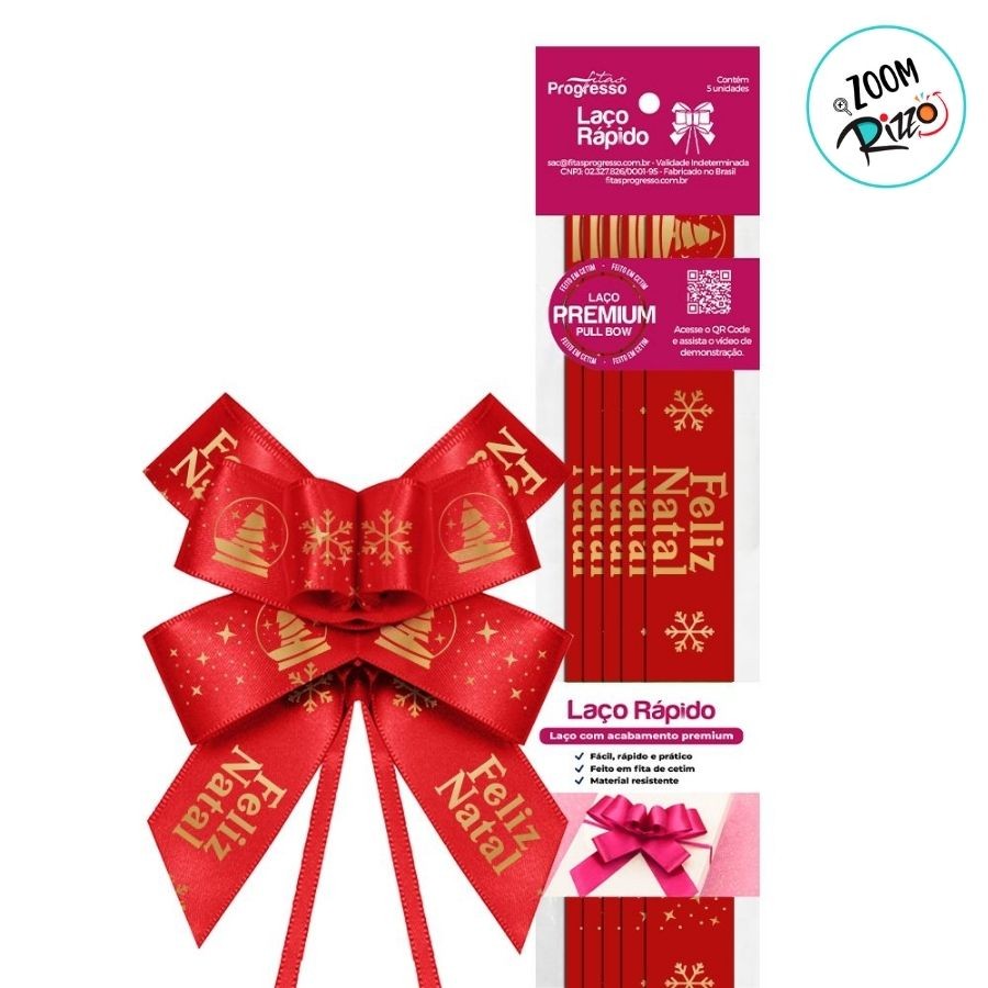 Laço Fácil de Fita de Cetim Decorada - Vermelho Feliz Natal - 22mm - 5 unidades - Progresso - Rizzo
