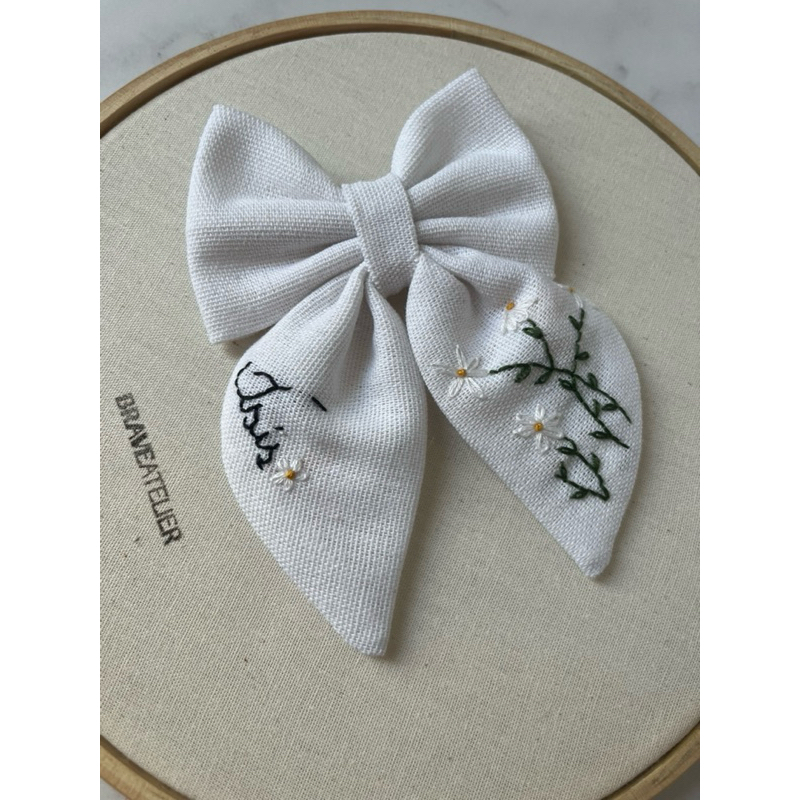 Laço Infantil Personalizado com Nome | Bordado em Linho com Flores | Presilha