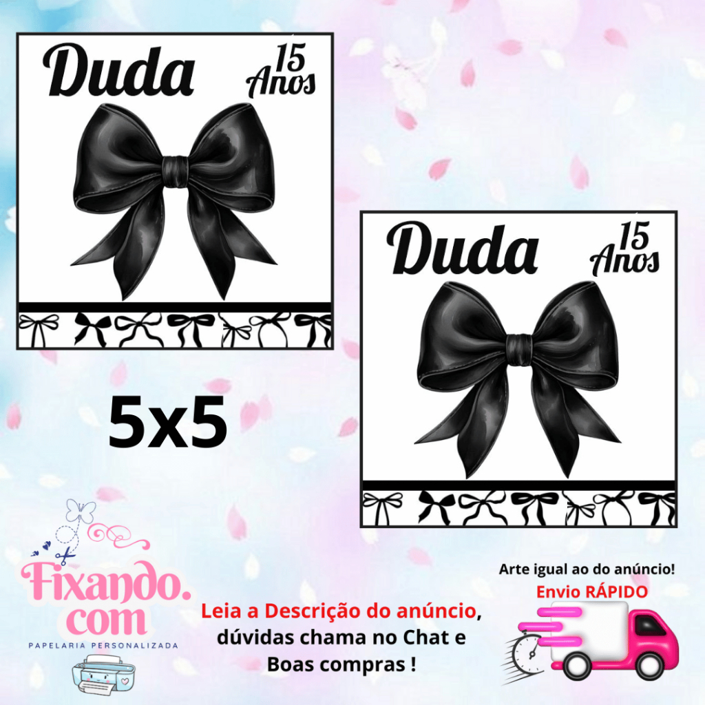 Tema: LAÇO PRETO ✨PAPEL ADESIVO 115G ✨REDONDO TAMANHO 5X5 ✨ QUADRADO TAMANHO 5X5 ✨ TUBETE TAMANHO 7X3,5 OBSERVAÇÃO: Os adesivos NÃO são em 3D ✨ Personalizáveis com o nome e idade ✨ Papel adesivo com brilho e alta qualidade ✨Não alteramos, nem trocamos as medidas dos adesivos ✨Não vai Recortado IMPORTANTE: Após efetuar sua compra, enviar nome e idade; *** SE ATENTEM EM MANDAR OS NOMES E IDADE NO ATO DA COMPRA*** ***NÃO TRABALHAMOS COM PEDIDOS DE URGÊNCIA !!!***