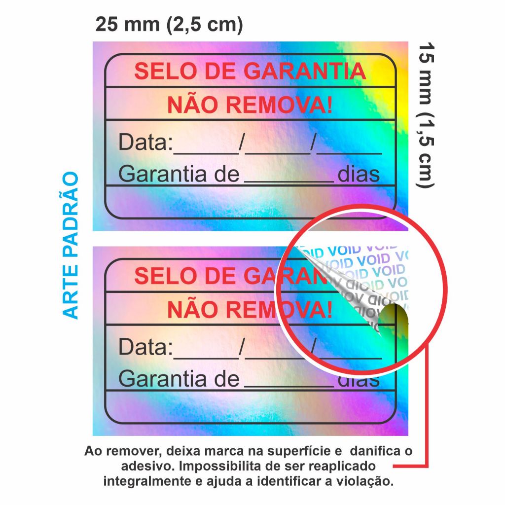 Selo de Garantia Lacre Void Holográfico - Pronta Entrega Ao remover, deixa marca na superfície e o adesivo é danificado. Impossibilita de ser reaplicado integralmente, ajudando a identificar a violação. Material já produzido e pronto para o envio. Não é possível solicitar personalização. Caso precise personalizado com seu logo, pesquise nossos produtos personalizáveis ou solicite o link via chat da Shopee. - Material ultra fino com alta aderência em diversos tipos de materiais. - Tamanho: 25x15 mm (2,5x1,5 cm)