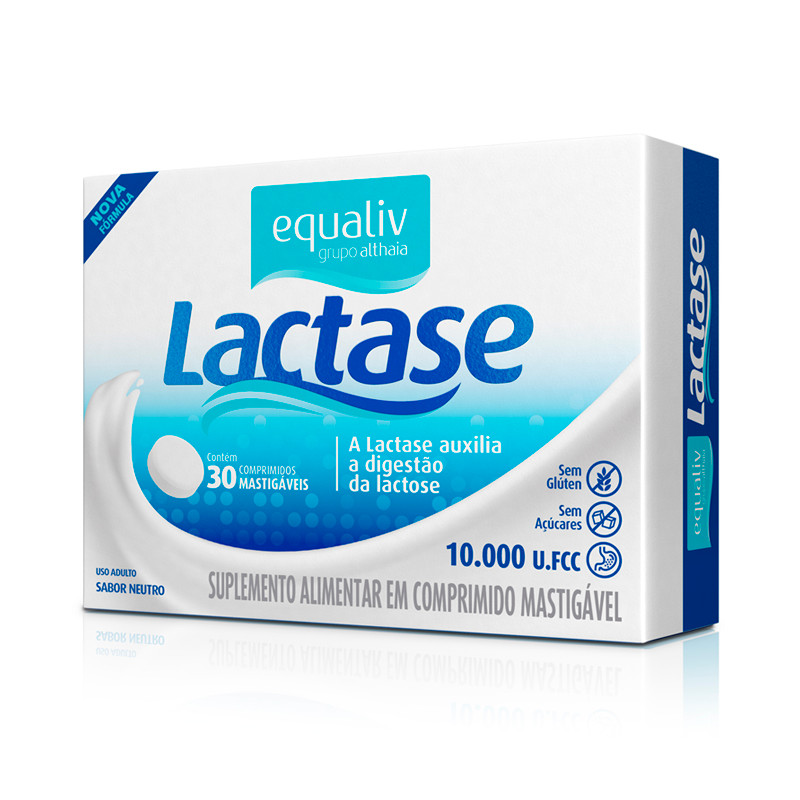NOVA FÓRMULA Equaliv Lactase (Aspergillus oryzae) é um suplemento alimentar em comprimidos mastigáveis que oferece 10.000 U.FCC (Unidade de atividade enzimática determinada segundo o Food Chemical Codex), sabor creme. Estudos mostram que a Intolerância à Lactose (IL) é uma síndrome a qual a pessoa apresenta sintomas de mal estar gastrointestinal após o consumo de alimentos que contenham lactose. Lactose é um açúcar presente em grande quantidade no leite, e que deve ser quebrada pela enzima lactase para uma melhor absorção pelo organismo. Caso contrário, situações de dor, distensão abdominal, flatulência, diarreia e vômito após o consumo de leite e laticínios, podem ocorrer. Equaliv Lactase auxilia na quebra da lactose e na promoção do bem-estar para uma alimentação sem grandes restrições. Modo de Usar: Recomenda-se consumir 1 comprimido mastigável no início de cada refeição que contenha lactose. Os comprimidos podem ser mastigados ou ingeridos com água. USO ADULTO. Ingredientes: Lactase de Aspergillus oryzae, (estabilizantes) manitol, celulose microcristalina (gel de celulose), hidroxipropilcelulose e croscarmelose sódica, (lubrificante) estearato de magnésio e (antiumectante) dióxido de silício. ALÉRGICOS: não contém. NÃO CONTÉM GLÚTEN.