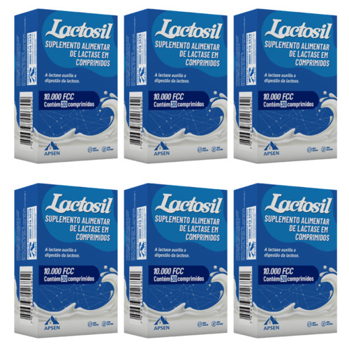 "KIT PROMOCIONAL C/06 CAIXAS C/30 COMPRIMIDOS CADA CAIXA" Como usar o Lactosil? Consumir 1 comprimido no momento da ingestão de produtos de origem láctea ou conforme orientação do médico ou nutricionista. Essa quantidade pode variar entre diferentes indivíduos e pode ser ajustada também a depender da quantidade de derivados lácteos ingeridos a cada refeição. Lactosil pode ser usado por adultos e crianças. Se preferir o tablete pode ser disperso em um pouco de água para sua ingestão. * Comprimido mastigável à base de lactase. *Indicado para pessoas intolerantes à lactose. *Facilita a digestão da lactose. *Evita a formação de gases, dores, inchaço abdominal.