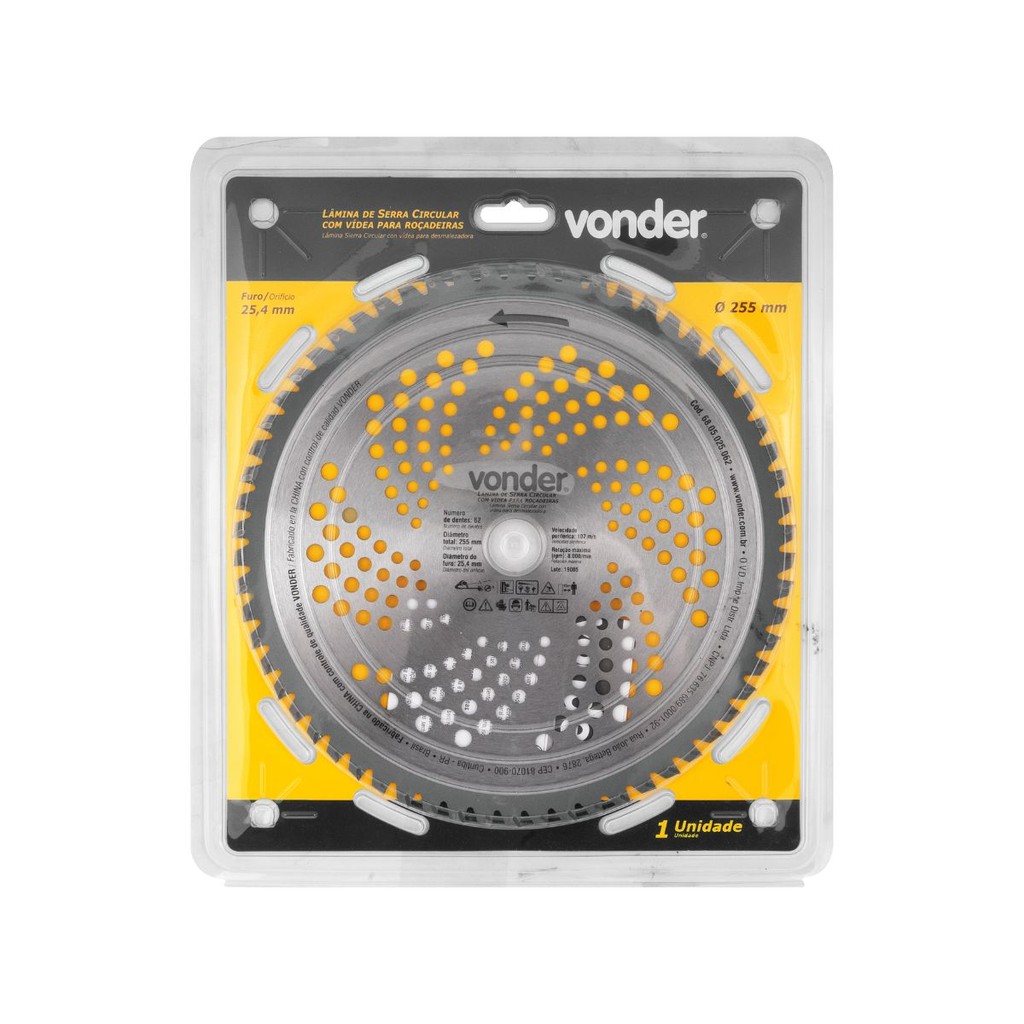 Lâmina circular com vídea, para roçadeiras, 255 mm x 25,4 mm, 62 dentes, VONDER Indicada para roçadeiras a gasolina. Atenção: nunca toque na lâmina com o equipamento ligado, utilize carretel com fio de nylon e não lâminas em terrenos com risco de pedras. Fabricada em aço especial com dentes de vídea, proporcionando maior resistência e durabilidade. Conteúdo da Embalagem: 1 Lâmina. Detalhes técnicos: Material da lâmina: Aço Diâmetro da lâmina: 255 mm Número de dentes: 62 dentes Espessura de corte: 2,0 mm Espessura do corpo: 1,3 mm Diâmetro do furo: 25,4 mm Rotação máxima (rpm): 8.000/min Velocidade periférica (máx.): 107 m/s Massa aproximada (peso): 0.43 kg