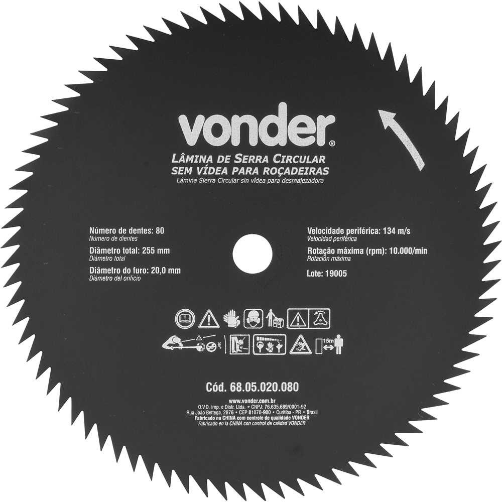 Lâmina Circular Sem Vídea, Para Roçadeiras, 255 Mm X 20 Mm, 80 Dentes, Vonder Fabricada em aço especial que proporciona maior resistência. Indicada para roçadeiras a gasolina. Atenção: nunca toque na lâmina com o equipamento ligado, utilize carretel com fio de nylon e não lâminas em terrenos com risco de pedras. Especificações Técnicas: Material da lâmina (tipo/composição): Aço Diâmetro da lâmina: 255 mm Número de dentes: 80 dentes Espessura de corte: 1,4 mm Espessura do corpo: 1,4 mm Diâmetro do furo: 20,0 mm Rotação máxima (rpm): 10.000/min Velocidade periférica (máx.): 107 m/s Massa aproximada (peso) (kg): 0.606 kg Conteúdo da Embalagem: 1 Lâmina.