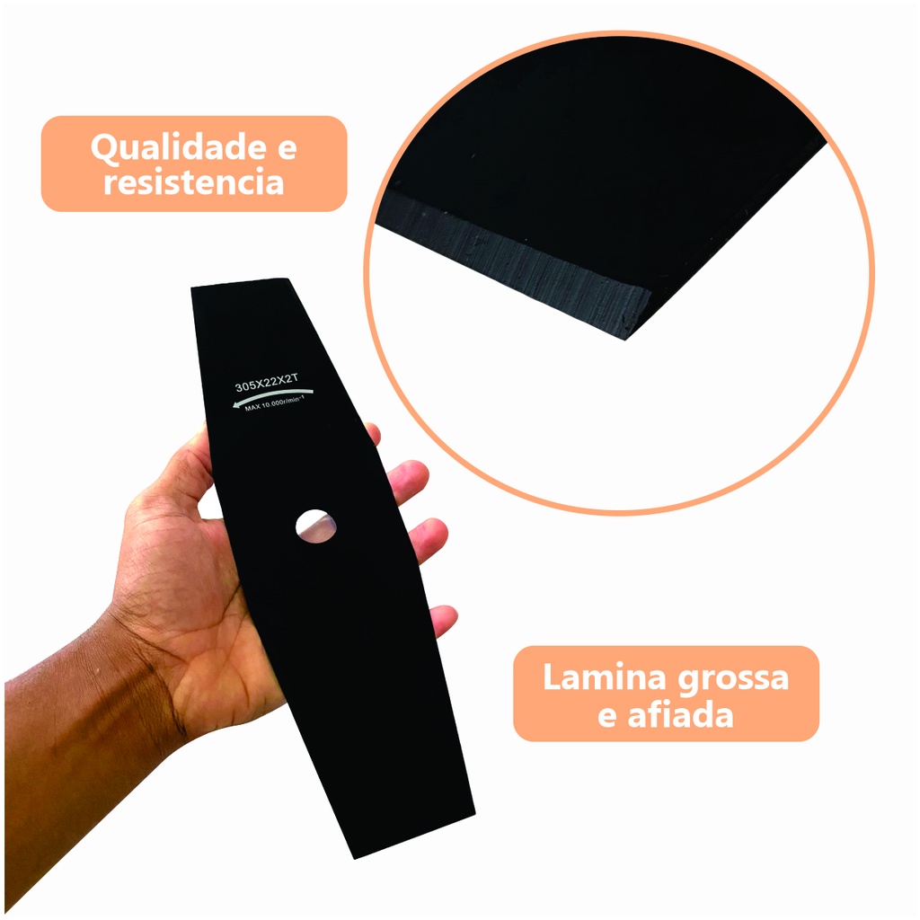 Diâmetro do furo: 25,4mm (acompanha uma arruela que reduz o furo central de 25,4mm para 20mm) A Lâmina De Corte Para Roçadeira 2 Pontas é um acessório para roçadeiras, que permite cortar grama, mato e arbustos de forma eficiente e segura. A lâmina tem duas pontas afiadas que giram em alta velocidade e cortam a vegetação com facilidade. A lâmina é feita de aço resistente e tem um furo central de 25,4mm (2,5cm) para encaixar na roçadeira. -------------------------------------------------------------------- - Material: Aço - Comprimento: 305mm (30 Centímetros) - Diâmetro do furo central: 25,4mm (2,5 Centímetros) - Envio IMEDIATO ------------------------------------------------------------------------------------ Vantagens de usar a lamina para roçadeiras de 2 pontas: - Maior eficiência na limpeza de terrenos com vegetação densa e alta como grama, capim, arbustos e galhos finos. - Menor desgaste do equipamento e do operador, pois a lamina corta com mais facilidade e rapidez. - A lâmina de corte de 2 pontas tem uma maior durabilidade e resistência do que as lâminas de nylon ou as de 3 ou 4 pontas, pois tem menos atrito com o solo e com os obstáculos. - Maior segurança, pois a lamina tem menos risco de se soltar ou quebrar durante o uso. - Maior versatilidade, pois a lamina pode ser usada em diferentes tipos de roçadeiras e terrenos. - Maior durabilidade, ela e mais fácil de afiar e trocar do que as outras lâminas, pois tem um formato simples e simétrico. - A lâmina de corte de 2 pontas proporciona um corte mais limpo e uniforme do que as outras lâminas, pois tem uma maior precisão e estabilidade na rotação.