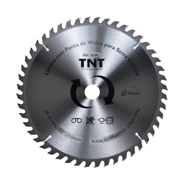 Descrição Marca TNT Usada para corte de compensados, MDFs e madeiras em geral Acompanha bucha de redução abaixo; 04 buchas de redução 30x25,4mm, 30x22,2mm, 30mmx19mm e 30mmx16mm Características; -250mm de diâmetro -24 ou 36 ou 48 ou 60 dentes à escolher no pedido -Espessura da pastilha 3,2mm -Espessura do disco 2,4mm -Furo de 30mm