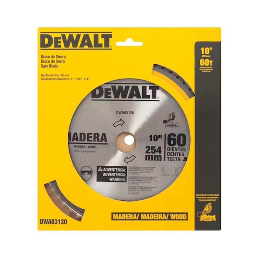 Lmina de Serra Circular 254mm (10") 60 Dentes DEWALT DWA03120 Caractersticas Lmina de Serra Circular 254mm x 60 Dentes Indicao para o corte de madeira. Dentes de carbeto afiados para cortes rpidos e suaves. Corte fino para ao de corte mais rpida e suave. Corpo de ao endurecido evita a deformao da lmina. Ideal para cortes juntamente com uma serra esquadria. CdigoModelo: DWA03120 Marca: Dewalt Especificaes Tcnicas Dimetro Externo: 254mm - 10" Furo: 30mm Anel: - Espessura do Disco: 1,8mm Espessura dos Dentes: 3mm Dentes: 60 ngulo do Dente: 12 Tipo do Dente: ATB Ponta do Dente: Carbeto Bucha de Reduo: 1" - 58" - 34" Aplicao: Madeira Imagens meramente ilustrativas. Todas as informaes divulgadas so de responsabilidade do fabricantefornecedor.