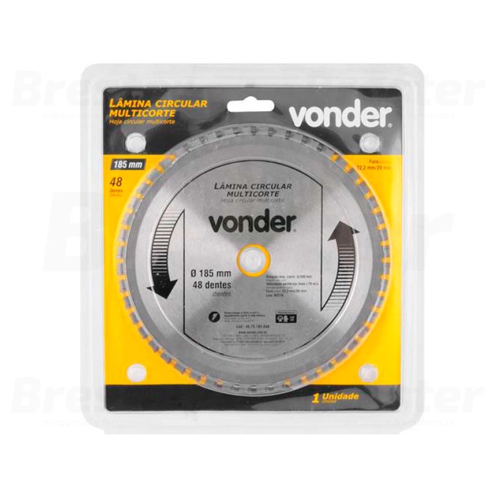 Olá, Bem vindo a Distribuidora Brester. Trabalhamos com uma grande variedade de ferramentas elétricas e manuais, descartáveis, eletroeletrônicos, artigos para casa, artigos de petshop e outros. Aqui você encontrará Produtos Originais, Nota Fiscal, Pronta Entrega e Envio Imediato! * Características do produto * Lâmina De Serra Circular Videa 185mm Vonder 4650060185 Vantagens: - Indicada para cortar ferro, alumínio, bronze, plástico, baquelite, madeira e gesso. - Utilizada em serra circular, acompanha bucha de redução para furo de 20 mm. - Possui dentes de metal duro (vídea) que possibilitam o corte de vários materiais sem precisar trocar a lâmina. Detalhes Técnicos: > Capacidade de corte (espessura): 1,6 mm > Diâmetro da lâmina: 185 mm > Diâmetro do furo da lâmina: 22,2 mm > Espessura de corte: 1,6 mm > Espessura do corpo da lâmina: 1,1 mm > Nº de dentes: 48 > Número de dentes da lâmina: 48 > Rotação máxima do disco (rpm): 4.000/min > Velocidade periférica (máx.): 70 m/s > Peso: 0,25 kg - Marca: Vonder - Garantia: 90 dias Obrigado por escolher a Brester Máquinas.
