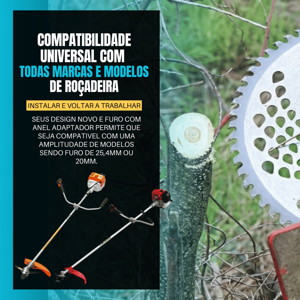 Lâmina / Disco para Roçadeira – 40 Dentes A lâmina de 40 dentes é a escolha ideal para quem busca corte eficiente, precisão e durabilidade no trabalho com roçadeiras. Desenvolvida para alto desempenho, ela garante um acabamento limpo e maior produtividade, mesmo em uso contínuo. Fabricada de acordo com as especificações originais de fábrica, oferece encaixe perfeito e funcionamento estável, devolvendo ao seu equipamento a performance ideal. Seu design com 40 dentes proporciona cortes mais rápidos, com menor esforço do motor e maior controle durante a operação. Compatível com roçadeiras multimarcas, atende modelos das marcas Toyama, STIHL, Husqvarna, Terra, Branco e outras, desde que respeitadas as medidas informadas. A instalação é simples e prática, permitindo retorno imediato ao trabalho. Especificações técnicas: Quantidade: 1 peça Aplicação: Roçadeiras Diâmetro: 255 mm Furo central: 25,4 mm (acompanha anel redutor para 20 mm) Espessura: 2 mm Número de dentes: 40 Importante: Antes da compra, verifique se as dimensões e especificações são compatíveis com o modelo da sua roçadeira. Alta confiabilidade, resistência e desempenho para quem exige mais do equipamento no dia a dia. Hashtags: