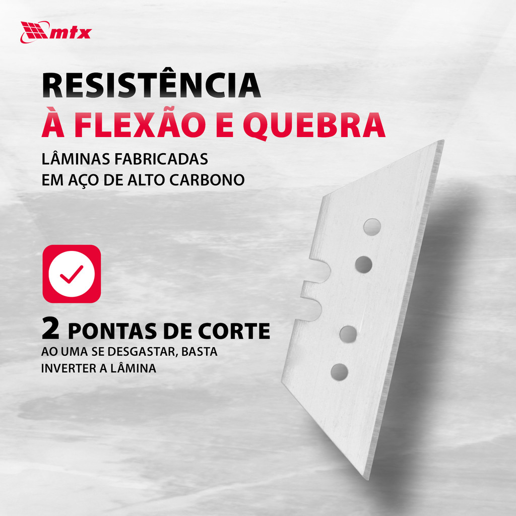 Lâminas Trapezoidais Retas MTX 7935559 - Peças de Reposição para Facas de Construção MTX As lâminas trapezoidais retas MTX 7935559 são peças de reposição essenciais para facas de construção MTX. Com bordas de corte afiadas e precisas, elas são ideais para cortar materiais diversos como linóleo, papelão, plástico, gesso cartonado e papel de parede. Essas lâminas de alta qualidade são usadas amplamente tanto no setor profissional quanto em tarefas de corte doméstico, oferecendo desempenho confiável e longa durabilidade. Vantagens das Lâminas Trapezoidais Retas MTX 7935559: Resistência à Flexão e Quebra: Fabricadas em aço de alto carbono, com espessura de 0,6 mm, as lâminas são extremamente resistentes à flexão e quebra. Essa característica permite que elas sejam extremamente duráveis, mesmo ao cortar materiais mais duros, sem perder a eficiência. Dupla Ponta de Corte: Cada lâmina possui duas pontas de corte afiadas. Quando uma ponta perde o corte, basta virar a lâmina e utilizar a outra ponta, garantindo maior economia e maior aproveitamento do produto, sem necessidade de substituições frequentes. Armazenamento Seguro e Prático: As lâminas trapezoidais MTX 7935559 são fornecidas em uma caixa de PVC resistente, oferecendo armazenamento prático e organização eficiente. A embalagem também ajuda a manter as lâminas protegidas contra danos e facilita o acesso rápido às ferramentas durante o uso. Custo-benefício e Praticidade: O conjunto de 5 lâminas oferece um suprimento duradouro, ideal para quem busca produtividade e economia sem abrir mão da qualidade. As lâminas são perfeitas para quem realiza trabalhos contínuos, proporcionando praticidade e conveniência. Aplicações das Lâminas Trapezoidais Retas MTX 7935559: As lâminas trapezoidais MTX 7935559 são ideais para cortar uma ampla variedade de materiais, incluindo linóleo, papelão, gesso cartonado, plástico e papel de parede. Elas são especialmente projetadas para facas de construção MTX, mas também são compatíveis com outras ferramentas de corte que utilizam lâminas trapezoidais. Seja para profissionais da construção civil ou amadores em casa, essas lâminas garantem precisão e eficácia em diversos tipos de corte, proporcionando desempenho superior.