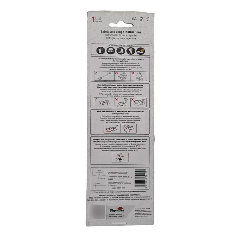 LÂMINA PARA ROÇADEIRA COM 2 PONTAS 350×25,4×2,0MM TOYAMA A Linha de acessórios originais da Toyama oferece versatilidade durante a limpeza e manutenção de gramados em jardins, terrenos e pastos. São mais de 20 opções entre lâminas e discos compatíveis com as roçadeiras Toyama e modelos multimarcas. As lâminas são amplamente utilizadas e indicadas para aparar gramas altas, matos e capins, pois realizam os cortes com mais facilidade e menor esforço do motor. A Lâmina 2 Pontas 350×25,4×2,0 mm Toyama, em aço de alta qualidade, com diâmetro de 350 mm, furo central de 25,4 mm e espessura de 2,0 mm é indicada para corte de vegetação baixa e sem obstáculos. Aplicação: TBC43H / TBC52H / TBC43SH / TBC43XP / TBC50XP / TBC33XP / TBC33XP-MHI-N / TBC43XP-MHI-N / TBC43XP-MHI nova / TBC43X-II / TBC43X-II 2 BOX / TBC52X-II / TBC52X-II 2 BOX / TBC63 / TBC43BX-II / TBC43X Premium / TBC52X Premium / TBC43XP-MY / TBC50XP-MY / TBC40X-4S / TBC40X-4S Especificações Técnicas: - Diâmetro de 350mm - Furo central de 25,4mm - Espessura de 2,0mm - Adaptador de Furo 20mm *Garantia: 03 meses contra defeitos de fabricação. *Imagens Meramente Ilustrativas. *Objetos de decoração das fotos não estão inclusos. *As cores podem variar conforme monitor/smartphone utilizado para a visualização do anúncio. *Não oferecemos serviço de montagem dos produtos, porém, acompanham esquema de montagem na embalagem; Recomendamos que o serviço seja feito por um profissional.