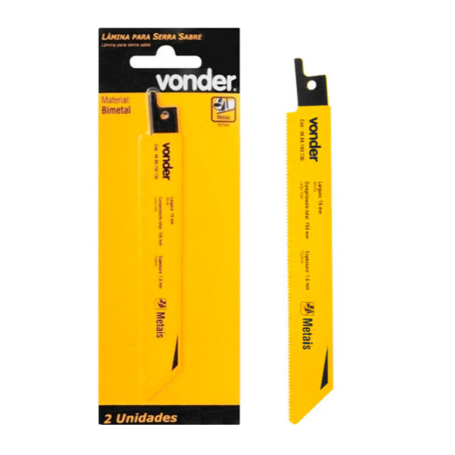 COMERCIAL VIPASA DISTRIBUIDORA. Lâmina Para Serra Sabre Tico Tico Para Corte De Madeira Ou Metal Serralheiro Marceneiro Uso Geral Lâmina para serra sabre, metal, VONDER Conteúdo da Embalagem 1 Lâmina Indicada para serras sabre a bateria VONDER e DWT, Comprimento total da lâmina para serra sabre:150,0 mm Largura da lâmina para serra sabre:19,0 mm Espessura:1,0 mm Número de dentes por polegada:18 dentes Material da lâmina para serra sabre: Bimetal Aplicação da lâmina para serra sabre: Metal COMERCIAL VIPASA DISTRIBUIDORA.