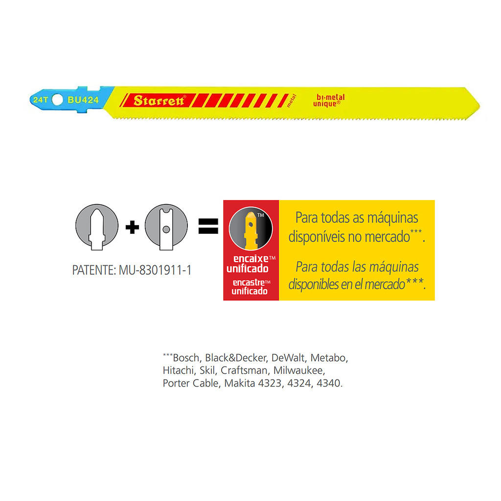 Lâmina Tico-Tico p/ Metal 100mm Starrett 24D BU424 Bi-Metal Características: - As lâminas de serra Tico-Tico com encaixe unificado Starrett são fabricadas com o novo AÇO Bi-Metal Unique e, portanto, incorporam a sua avançada performance de corte, ou seja, a nova “Starrett Bi-Metal Unique Saw Technology”; - Devido ao ENCAIXE UNIFICADO, as lâminas de serra podem ser usadas em todos os modelos de máquina (Black&Decker, Bosch, Craftsman, DeWalt, Makita 4323-4324-4340, Metabo, Milwaukee, Porter Cable, Skil etc.). Vantagens: - Rendimento 25% superior às lâminas de serra bi-metálicas convencionais; - 170% maior área de contato entre os metais comparado com as tecnologias existentes e com isso uma maior resistência quanto à quebra e ao arrancamento dos dentes da lâmina de serra; - Cortes mais suaves devido às múltiplas arestas de corte - “Multi Edge Performance” e ao efeito de divisão de cavacos - “Split-Chip Advantage”; - Lâmina de serra inquebrável durante o uso e à prova de estilhaçamento; - Menor custo por corte. Dados Técnicos: - Marca: Starrett; - Modelo: BU424; - Aplicação: Metal; - Dentição: 24; - Capacidade em Polegadas: 9/32 – 1/2"; - Maquina: Black&Decker, Bosch, Craftsman, DeWalt, Makita 4323, Makita 4324, Makita 4340, Metabo, Milwaukee, Porter Cable, Skil, Hitachi; - Tipo de Corte: Reto/Curvo; - Tipo de Lâmina: Bi-Metal Unique. Componentes Inclusos: - 01 Lâmina Tico-Tico Metal Avulsa 100mm Starrett 24D BU424.