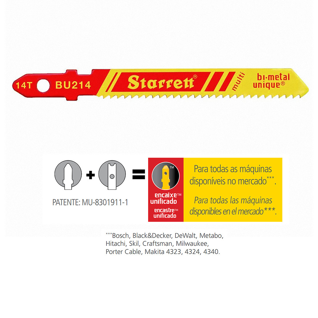 Lâmina Tico-Tico Multi 50mm Starrett 14D BU214 Bi-Metal Características: - As lâminas de serra Tico-Tico com encaixe unificado Starrett são fabricadas com o novo Aço Bi-Metal Unique e, portanto, incorporam a sua avançada performance de corte, ou seja, a nova “Starrett Bimetal Unique Saw Technology”. - Devido ao encaixe unificado, as lâminas de serra podem ser usadas em todos os modelos de máquina (Black&Decker, Bosch, Craftsman, DeWalt, Makita 4323-4324-4340, Metabo, Milwaukee, Porter Cable, Skil etc.). Vantagens: - Rendimento 25% superior às lâminas de serra bi-metálicas convencionais. - 170% maior área de contato entre os metais comparado com as tecnologias existentes e com isso uma maior resistência quanto à quebra e ao arrancamento dos dentes da lâmina de serra. - Cortes mais suaves devido às múltiplas arestas de corte - “Multi Edge Performance” e ao efeito de divisão de cavacos - “Split-Chip Advantage”. - Lâmina de serra inquebrável durante o uso e à prova de estilhaçamento. - Menor custo por corte. Dados Técnicos: - Marca: Starrett; - Linha: Bi-Metal Unique; - Modelo: BU214; - Aplicação: Multiuso; - Dentição: 14; - Dimensões: 51 x 7,5 x 1,0 mm; - Compatível com as máquinas: Black&Decker, Bosch, Craftsman, DeWalt, Makita 4323, Makita 4324, Makita 4340, Metabo, Milwaukee, Porter Cable, Skil, Hitachi; - Tipo de Corte: Reto/Curvo; Componentes Inclusos: - 01 Lâmina Tico-tico Avulsa Multi 50mm Starrett 14D BU214.