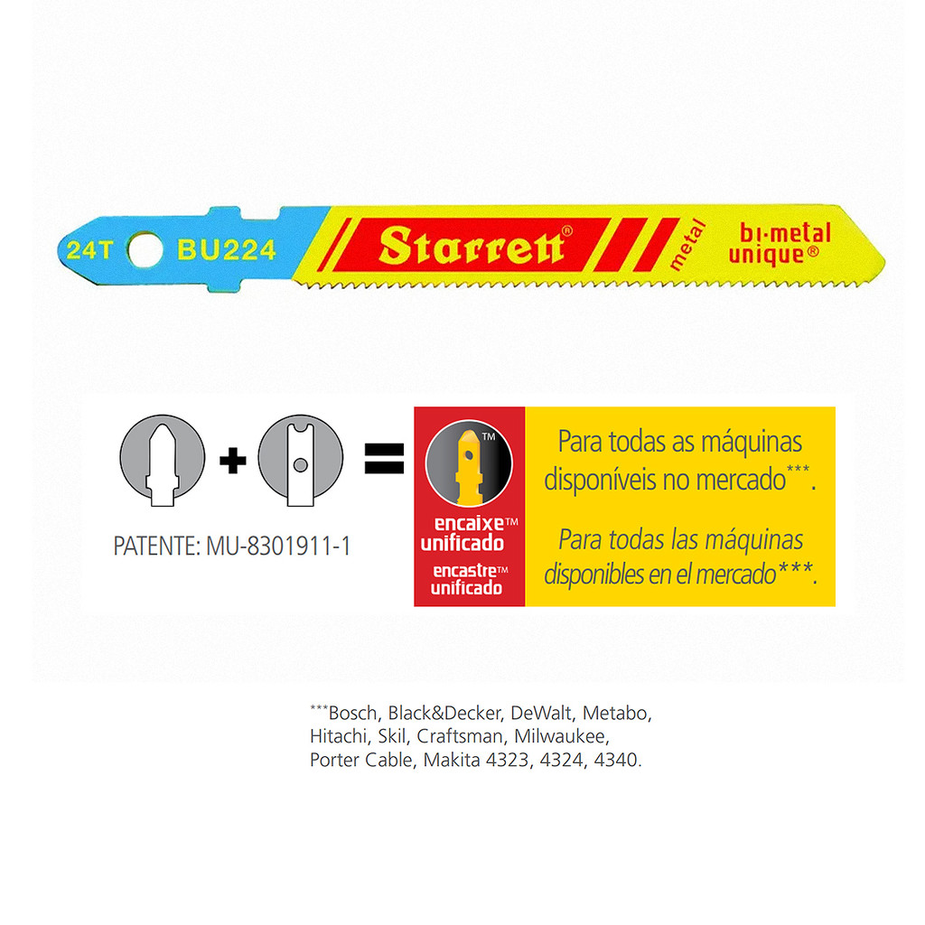 Lâmina Tico-Tico p/ Metal 50mm Starrett 24D BU224 Bi-Metal Características: - As lâminas de serra Tico-Tico com encaixe unificado Starrett são fabricadas com o novo Aço Bi-Metal UNIQUE e, portanto, incorporam a sua avançada performance de corte, ou seja, a nova “Starrett Bi-Metal Unique Saw Technology”; - Devido ao ENCAIXE UNIFICADO, as lâminas de serra podem ser usadas em todos os modelos de máquina (Black&Decker, Bosch, Craftsman, DeWalt, Makita 4323-4324-4340, Metabo, Milwaukee, Porter Cable, Skil etc.). Vantagens: - Rendimento 25% superior às lâminas de serra bi-metálicas convencionais; - 170% maior área de contato entre os metais comparado com as tecnologias existentes e com isso uma maior resistência quanto à quebra e ao arrancamento dos dentes da lâmina de serra; - Cortes mais suaves devido às múltiplas arestas de corte - “Multi Edge Performance” e ao efeito de divisão de cavacos - “Split-Chip Advantage”; - Lâmina de serra inquebrável durante o uso e à prova de estilhaçamento; - Menor custo por corte. Dados Técnicos: - Marca: Starrett; - Linha: Bi-Metal Unique; - Modelo: BU224; - Aplicação: Metal; - Capacidade em Polegadas: 9/32 – 1/2"; - Dentição: 24; - Dimensão em mm: 51 x 7,5 x 1,0mm; - Maquina: Black&Decker, Bosch, Craftsman, DeWalt, Makita 4323, Makita 4324, Makita 4340, Metabo, Milwaukee, Porter Cable, Skil, Hitachi; - Tipo de Corte: Reto/Curvo; Componentes Inclusos: - 01 Lâmina Tico-Tico Metal Avulsa 50mm Starrett 24D BU224.
