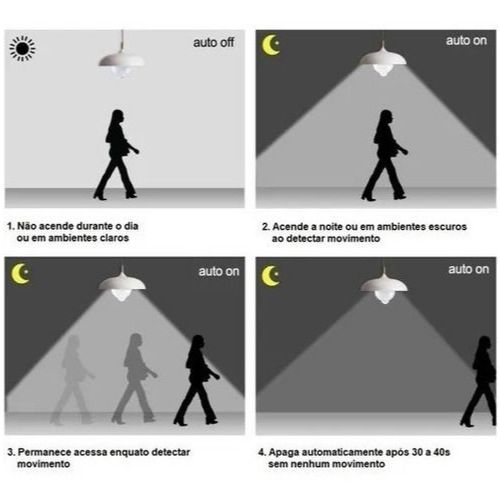** LÂMPADA DE LED 9W COM SENSOR DE MOVIMENTO E CLARIDADE *** Lâmpada de led 9w com sensor de movimento e sensor de claridade. Acende automaticamente ao detectar movimento e somente se o ambiente estiver escuro. Muita economia pois se apaga cerca de 30 segundos após não detectar nenhum movimento. Ideal para instalar em corredores, garagens, escadas, próximo de portas, etc. QUALIDADES DO PRODUTO: - Sensor de claridade, não acende se o ambiente estiver claro - Sensor de movimento, acende ao detectar movimento cerca de 2 a 3 metros de distancia da lâmpada - Lâmpadas de LED oferecem ótima iluminação e economia de até 90% na energia elétrica. - Apaga cerca de 30s após não detectar nenhum movimento CARACTERÍSTICAS: - Potência: 9W (560 lumens) - Cor da Luz: 6500K (Branco Frio) - Soquete: E27 (O MESMO DE LÂMPADAS COMUNS) - Alimentação: Bivolt 110/220V - Vida útil: 30.000 horas - Medidas: 6cm largura x 12cm altura COMO USAR: 1- Rosquear a lâmpada em um soquete comum de lâmpadas, padrão e27 2- Acender o interruptor normalmente 3- A lâmpada ira acender ao detectar movimento e o ambiente estiver escuro 4- A lâmpada se apaga automaticamente 30s após não detectar nenhum movimento CONTEÚDO DA EMBALAGEM: - 01 Lâmpada de led 9w com sensor de movimento e claridade - 01 Embalagem original