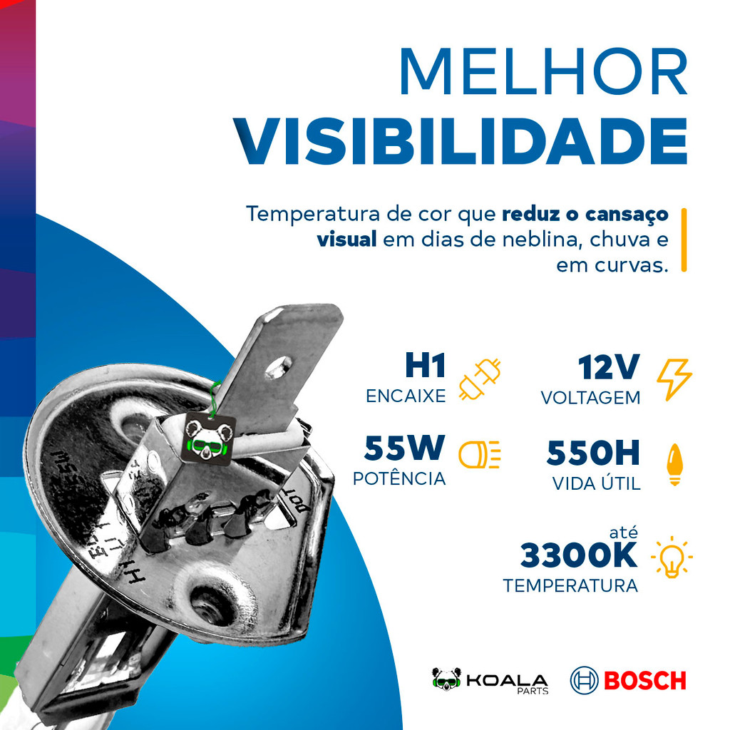 Lâmpada Automotiva Halógena H1 Pure Light 12V 55W P14.5s Bosch Dirigir no escuro ou na neblina com luz fraca? Esquece! A Bosch, líder mundial em autopeças, sabe que no volante visibilidade é vida. A H1 Pure Light entrega a luz que você precisa para dirigir com segurança e presença. - Encaixe H1 P14.5s - Luz branca amarelada que não cansa a visão - Maior visibilidade em chuva, neblina e curvas Sinta a clareza e a visibilidade que a linha Pure Light oferece — qualidade Bosch com a mesma precisão das peças originais do seu veículo. TECNOLOGIA COM BRILHO INTENSO E ESTÁVEL Oferece luz forte e acionamento rápido para você enxergar mais e melhor. RESISTÊNCIA AO SUPERAQUECIMENTO Material reforçado para maior durabilidade e vida útil prolongada, com até 550 horas de uso. ATÉ 3.300 K COM LUZ BRANCA AMARELADA Temperatura de cor que reduz o cansaço visual em neblina, chuva e curvas. E o melhor? Elas duram muito mais, pra você trocar menos e dirigir tranquilo. Fácil de instalar, perfeita pra quem quer qualidade e praticidade na mesma peça. Encaixe H4 e base P14.5s, ideal para: - Faróis de neblina - Luz de estrada / cruzamento - Faróis auxiliares Dicas de Manutenção Bosch: 1. Tenha sempre reserva: Leve uma lâmpada extra no carro para emergências. 2. Use luvas na troca: Evita marcas nos vidros e aumenta a vida útil. 3. Troque em pares: Se uma queimou, a outra logo vai falhar. 4. Renove a cada 2 anos: Luzes perdem intensidade com o tempo. Enviamos bem embalado, super rápido e com garantia de originalidade. A segurança na estrada começa pela clareza com que você enxerga o mundo lá fora. Garanta a sua e confira os outros produtos da nossa loja – Koala Parts Especificações Técnicas: Encaixe: H1 Base: P14.5s Tecnologia: Halógena Cor: Branca amarelada Temperatura: Até 3.300 K Fluxo luminoso: Até 1.450 lm Vida: Até 550 horas Tensão nominal: 12V Potência: 55W Linha: Pure Light Código Bosch: 1 987 302 011 Conteúdo da Embalagem: 1 Lâmpada Halógena H1 12V 55W P14.5s Bosch