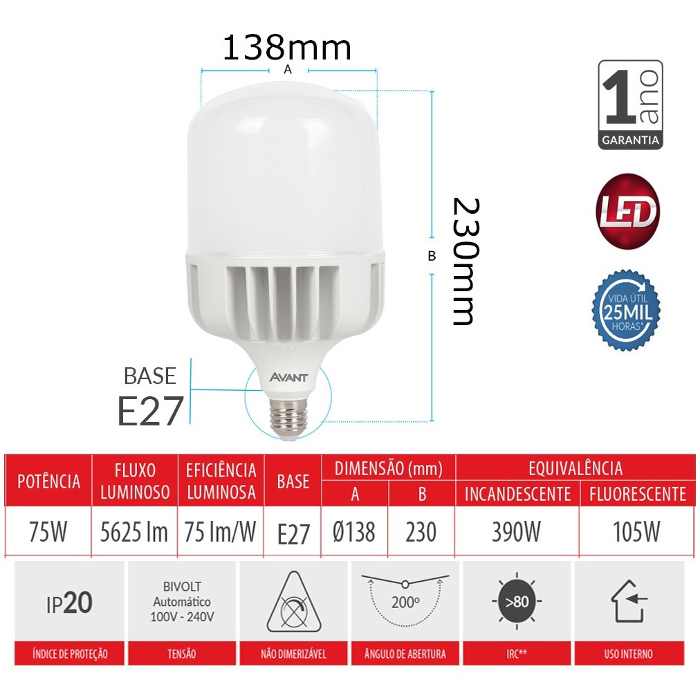 Lâmpada Bulbo Hp Led E27 Branco Frio 6500K 75w Bivolt Avant A Lâmpada LED BULBO HP é indicada para iluminação industrial e comercial de grandes áreas. - Não aquece o ambiente (não emite infravermelho). - Possui driver interno isolado. - Não desbota objetos (não emite ultravioleta). - Composição livre de mercúrio. - Baixo consumo de energia em relação as lâmpadas incandescentes e fluorescentes. - Alto fluxo luminoso. - Led - Vida útil aproximado de 25 mil horas. - Indicado para uso Interno Referencia: 5835 - Modelo: Bulbo HP (Série MK-F) - Marca: Avant - Potência: 75 Watts - Fluxo Luminoso: 5625 Lumens - Eficiência Luminosa: 75 Lumens / Watts - Base: E27 - Tensão de Entrada: 100v a 240v ( Bivolt Automático). - Temperatura da Cor: 6500K - Emissão de Luz: Branco Frio - Temperatura Ambiente: -5c a 40c - Indicado para Uso: Uso Interno - Ângulo de Abertura: 200 - IRC**: >80 - Índice de Proteção: IP20 - Material: Corpo da lâmpada e difusor em policarbonato - Equivalência Incandescente: 390 Watts - Equivalência Fluorescente: 105 Watts - Vida útil: 25.000 Horas - Cor da Carcaça: Branco - Material: Corpo e bulbo em plástico e alumínio. - Garantia: 1 Ano Dimensões Aproximadas: - A: 138mm - B: 230mm