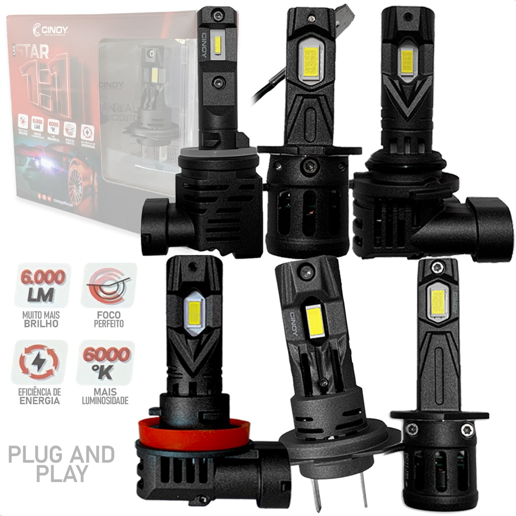 Lâmpada Super LED Branca Mini Cinoy Star 1:1 Eficiente Performance Luminosidade Plug and Play IP65 150m DC12V 30w cada 6000 Lúmens 6000 Kelvins Dissipador de Calor Ventoinha H1 H3 H7 H8 H9 H11 9005 9006 HB3 HB4 HIR2 9012 H27 * CASO NECESSITE DO MODELO H4, NOS ENVIE MENSAGEM NO CAMPO DE PERGUNTA ABAIXO QUE ENVIAREMOS O LINK * * PARA USO EM VEÍCULOS LEVES - 12V • MODELO: TEMOS TODOS MODELOS DISPONÍVEIS (CASO PRECISE NÃO ENCONTRE AQUI, MANDE MENSAGEM) [ESPECIFICAÇÕES TÉCNICAS] • Conexão Plug and Play • Super Compacta • Não possui reator externo • Iluminação direta de até 150 metros • Luz super branca • Foco perfeito • Eficiência energética • Máxima luminosidade e performance • Fácil instalação • Resfriamento por cooler (ventoinha) • Tamanho: 1:1 (similar originais do carro) • Alimentação: DC 12v • Potência: 30w (cada) • Temperatura de cor: 6000 Kelvins • Fluxo Luminoso: 6000 Lúmens (par) • IP65: Proteção total contra poeira, resíduos e jatos de água. • Vida útil: Aprox: 30.000 hrs • Validade: Indeterminada [COMPOSIÇÃO] • Alumínio de Aviação, LED, cobre e borracha [GARANTIA - CONTRA DEFEITO DE FABRICAÇÃO] • Prazo de 12 meses [CONTEÚDO DA EMBALAGEM] • 1 Par de lâmpadas LED Star 1:1 Cinoy • 1 Manual de instalação