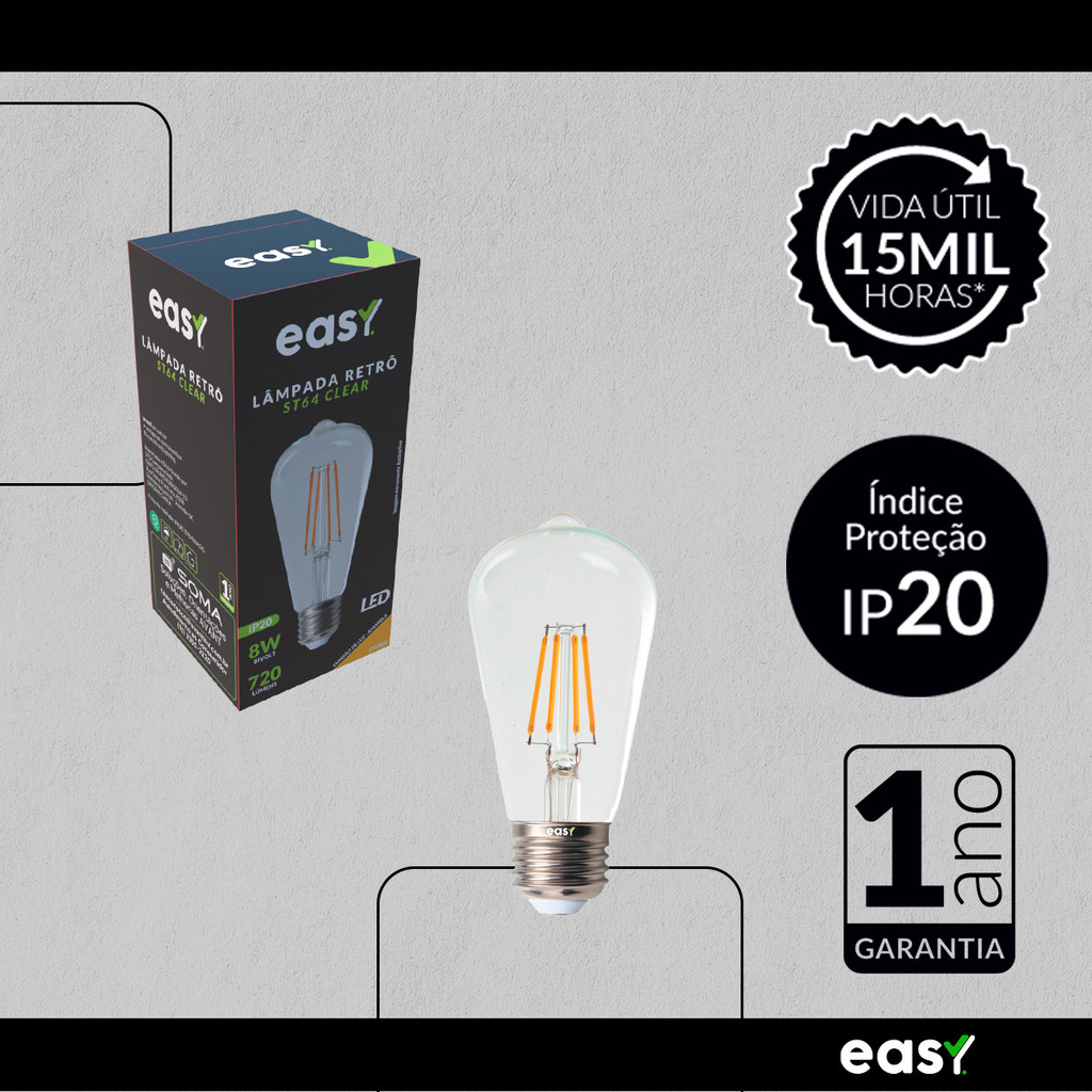 Lâmpada LED Retrô ST64 Clear 8W - Easy A lâmpada Retrô Easy by Avant é indicada para iluminação aconchegante e decorativa. Ideal para pendentes, luminárias e arandelas, proporcionando um toque vintage e elegante ao seu ambiente. Propriedades: Corpo em vidro transparente; Possui driver interno isolado; Eficiência luminosa: 90 lm/W; Temperatura de cor: 2400K (amarelo quente); Ângulo de abertura: 270°; IRC: >80. Características de Funcionamento: Temperatura ambiente: -5°C a 40°; Tensão de entrada: 100V a 240V; Fator de potência: >0,50; Bivolt automático; Não dimerizável. Especificações Técnicas e Comerciais: Código: 399012770 Modelo: ST64 Clear Potência: 8W Base: E27 Fluxo luminoso: 720 lm Dimensões: A: 43 mm, B: 142 mm Peso: 60g Garantia: A Lâmpada LED Retrô Easy ST64 Clear possui Garantia Oficial de 12 meses para defeitos de fabricação. Sobre a Marca Easy by Avant: A Easy by Avant é uma marca reconhecida por sua paixão por iluminação, oferecendo produtos de alta qualidade e design inovador, sempre buscando aliar funcionalidade e beleza em cada detalhe. A marca se destaca por seus produtos eficientes e de baixo consumo, proporcionando experiências luminosas agradáveis e duradouras.