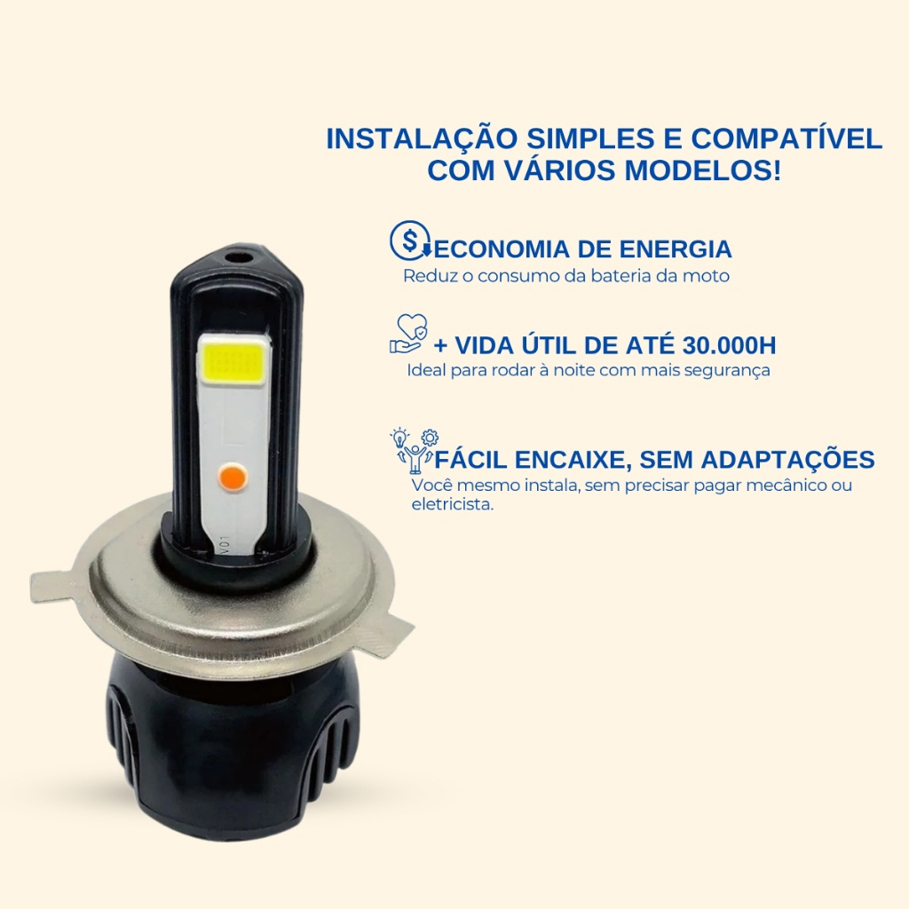 Lâmpada Farol LED H4 Moto 3D – Efeito Bi-Xenon | Super Branca 8000K | Alta Potência e Alcance Iluminação de verdade para quem exige desempenho, estilo e segurança! A Lâmpada de Farol LED H4 com Efeito Bi-Xenon é ideal para transformar o visual da sua moto e melhorar a visibilidade nas ruas e estradas. Com design moderno, fácil instalação e potência que impressiona, ela entrega luz branca intensa e foco preciso em qualquer situação. Aplicação Universal para Motos H4: Compatível com faróis H4 de motos que utilizam sistema de corrente alternada (AC) ou corrente contínua (DC). Ex: Fan 160, CG 150, CB 300, Falcon e outros modelos com soquete H4. Acompanha na Embalagem: 1x Lâmpada de LED com Efeito Bi-Xenon 3x Adaptadores H4 para diferentes encaixes 1x Mola de fixação 1x Reator montado (pronto para uso) Instalação Fácil: Não precisa cortar fios ou modificar o farol! A lâmpada foi desenvolvida com medidas padrão para encaixe perfeito e seguro, respeitando as especificações do modelo original. Tecnologia de Ponta: Efeito Bi-Xenon: Iluminação dupla, com alto e baixo eficazes Cor da Luz: Branco super intenso – 8000K LEDs de Alta Potência: 3 Super LEDs com foco otimizado Ângulo do feixe: 360° para maior cobertura e visibilidade Voltagem: 9V a 18V (AC/DC) Potência: 20W a 40W Alcance: Pode aumentar em até 80% o alcance da luz, dependendo do bloco óptico da moto Durabilidade Impressionante: Mais de 30.000 horas de uso Resistente a vibrações e variações de temperatura Ideal para uso diário e viagens longas Observações: Verifique o tipo de soquete do seu farol (H4) antes da compra. A instalação pode ser feita por conta própria, mas recomendamos um profissional para melhor ajuste, se necessário. Pronta Entrega + Envio Rápido Produto no Brasil, com envio imediato e garantia de qualidade! Dúvidas? Fale conosco no chat. Atendimento rápido e personalizado!