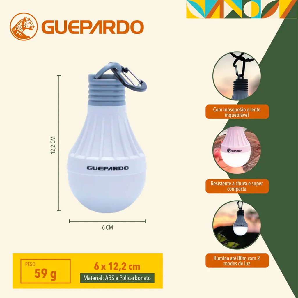 # Auto Equip # Seja bem-vindo(a)!!! --- Descrição:Lâmpada inteligente de LED Guepardo Tent Megalite - NTK Transforme sua casa com a Lâmpada Inteligente Tent Megalite Unica NTK! Experimente a praticidade e a versatilidade do controle de iluminação inteligente, ajustando a cor e a intensidade da luz diretamente do seu smartphone. Crie o ambiente ideal para relaxar, trabalhar, entreter ou simplesmente desfrutar de uma atmosfera única. Lâmpada de LED resistente a chuva - Acompanha mosquetão para melhor fixação - 80 lúmens de potência - Possui 2 modos de iluminação A Tent Megalite da Guepardo é uma lâmpada inteligente para barracas de camping, áreas externas de casas e apartamentos e qualquer tipo de aventura. Esse modelo de LED tem o poder de iluminação de até 80 lúmens, alcance de iluminação de até 80 metros e tempo de iluminação que pode alcançar até 10 horas através da utilização de 1 pilha AA (não inclusa). Possui 2 modos de iluminação: alta e SOS, conta com lente de policarbonato inquebrável, além de ser resistente a chuva. É a lâmpada ideal para iluminar suas noites de camping com muito conforto e tranquilidade, ideal para utilizar dentro de barracas, já que conta com mosquetão incluso. A lâmpada inteligente Guepardo é fabricada com o LED Philips 3535 branco que ilumina de forma limpa e potente. Características Principais: - Ajuste de Intensidade: Regule o brilho da luz para criar o nível de iluminação perfeito para cada atividade, desde uma leitura relaxante até uma festa animada. - Fácil Instalação: Simples de instalar, a lâmpada se adapta a qualquer soquete padrão E27. - Durabilidade e Economia: Aproveite a longa vida útil da lâmpada LED, economizando energia e reduzindo seus custos com eletricidade. - Compatibilidade: Compatível com assistentes virtuais como Google Assistant e Alexa (verifique compatibilidade antes da compra). Informações gerais: - Material: ABS e policarbonato - Peso: 59g - Dimensões: 6 x 12,2cm - Potência: 80 lúmens - Tempo de iluminação: 10 horas - Bateria: 1 AA (não inclusa) - Marca: Guepardo Benefícios: - Personalização Infinita: Crie o ambiente perfeito para qualquer momento e ocasião. - Economia de Energia: Reduza o consumo de energia com a tecnologia LED eficiente. - Design Moderno: A lâmpada possui um design elegante e moderno, que se adapta a qualquer ambiente. - Compre agora a sua Lâmpada Inteligente Tent Megalite Unica NTK e transforme a iluminação da sua casa! Conteúdo da Embalagem: - 01 Lâmpada inteligente de LED Guepardo Tent Megalite - NTK Importante - Garantia de 3 meses; - Pedidos aprovados até 12h00 de segunda a sexta será enviada no mesmo dia; - Enviamos em até 24h úteis; - A embalagem pode variar de acordo com o estoque do fabricante; - Imagens meramente ilustrativas; - A cor do produto pode variar de acordo com a tela do seu smartphone ou computador; - Utilize o campo de "Perguntas e respostas" e esclareça suas dúvidas com nosso suporte técnico. - Todas as informações divulgadas são de responsabilidade do Fabricante/Fornecedor